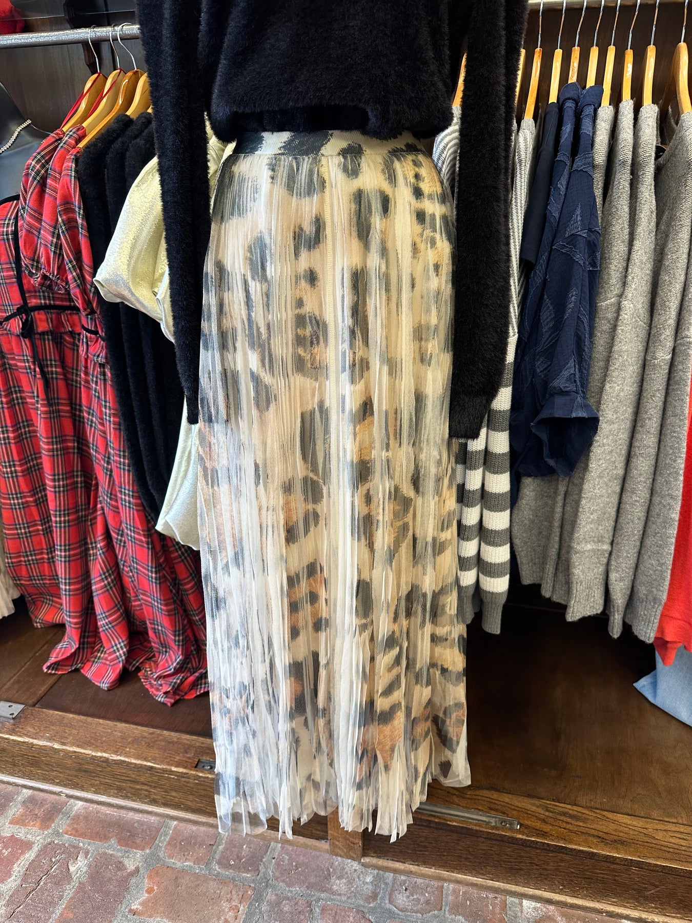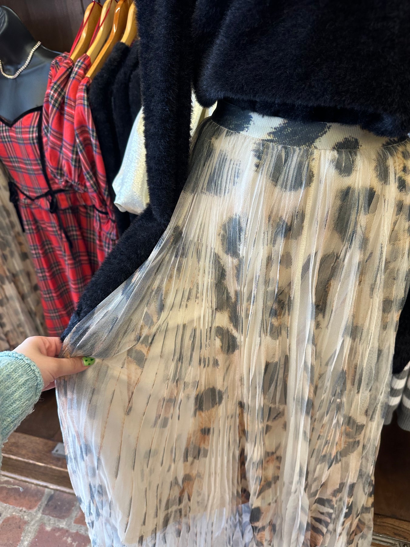 Elevate your wardrobe with this stunning leopard pleated tulle skirt—a perfect blend of bold pattern and romantic silhouette. The delicate tulle fabric creates an ethereal, voluminous shape while the classic leopard print adds an edgy, sophisticated touch. Pleated detailing enhances movement and dimension, making this skirt ideal for everything from brunch dates to evening events. Versatile enough to pair with casual tees or dressy tops, this piece instantly transforms any outfit into something memorable. Make a statement without saying a word.