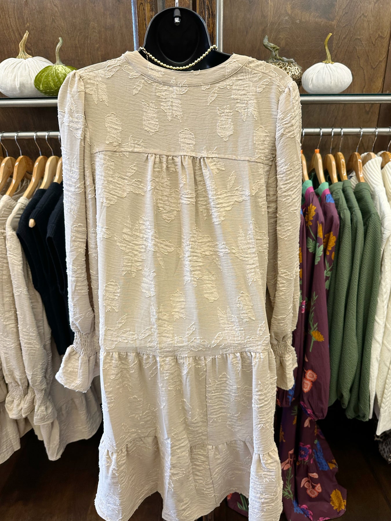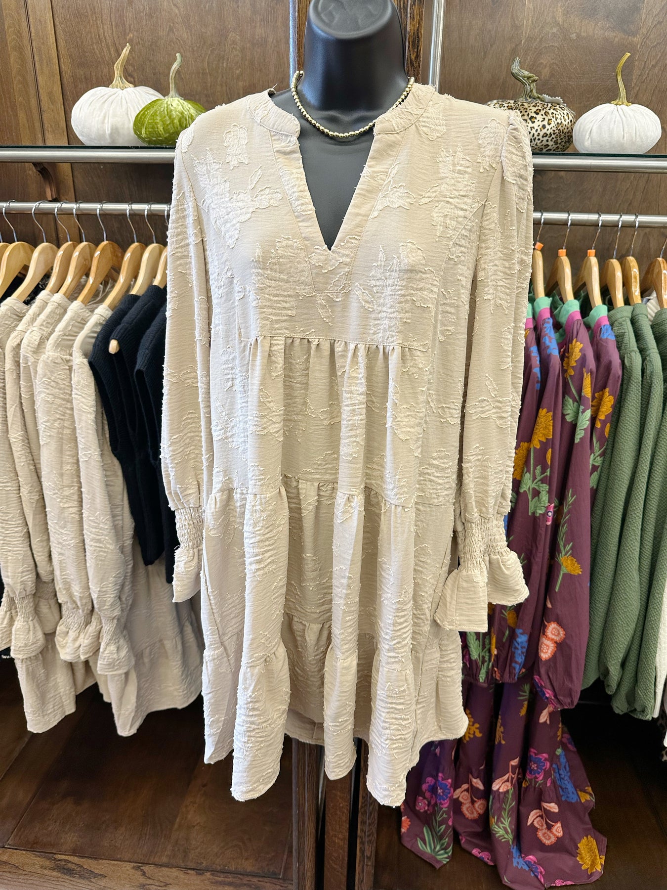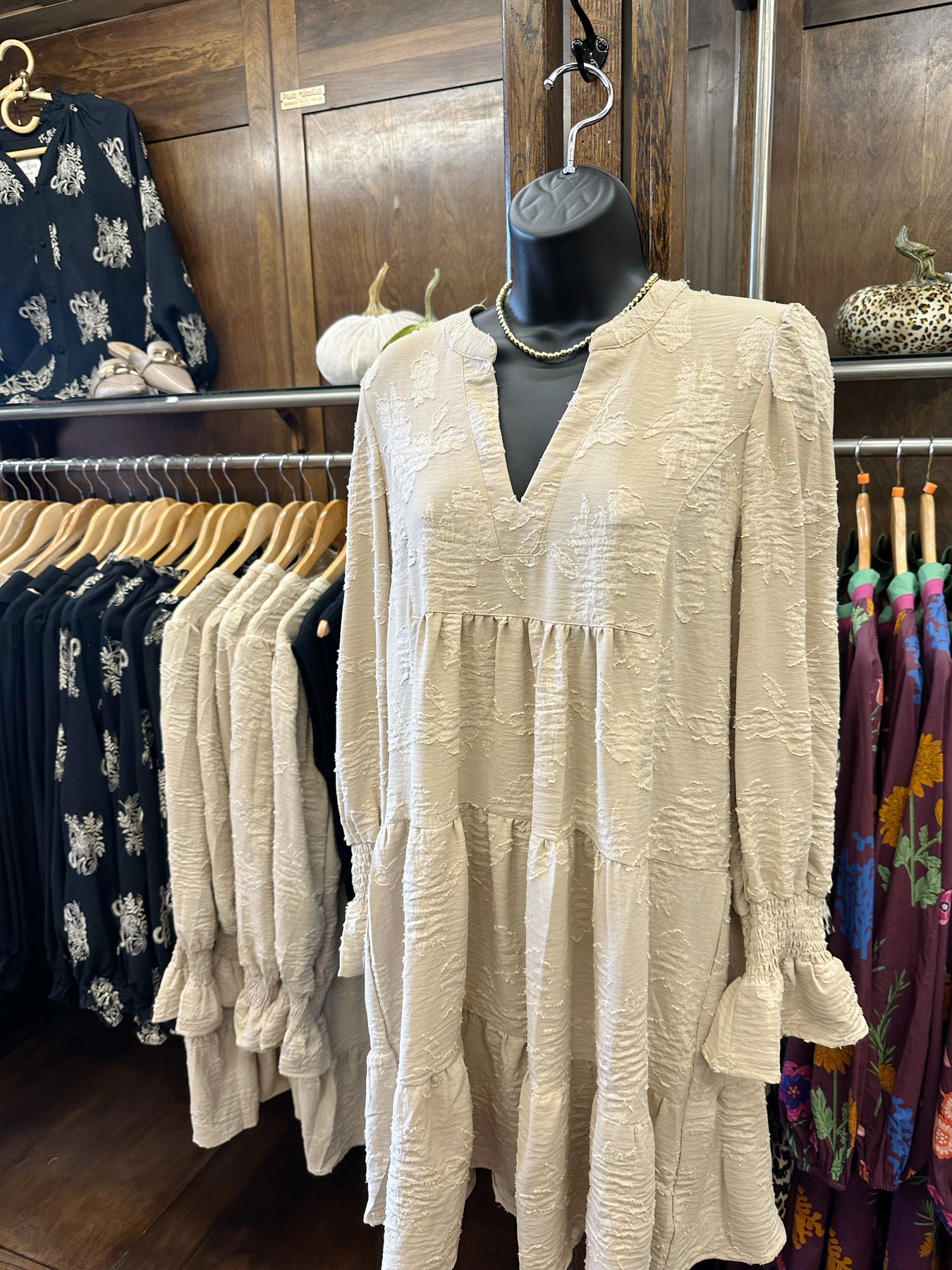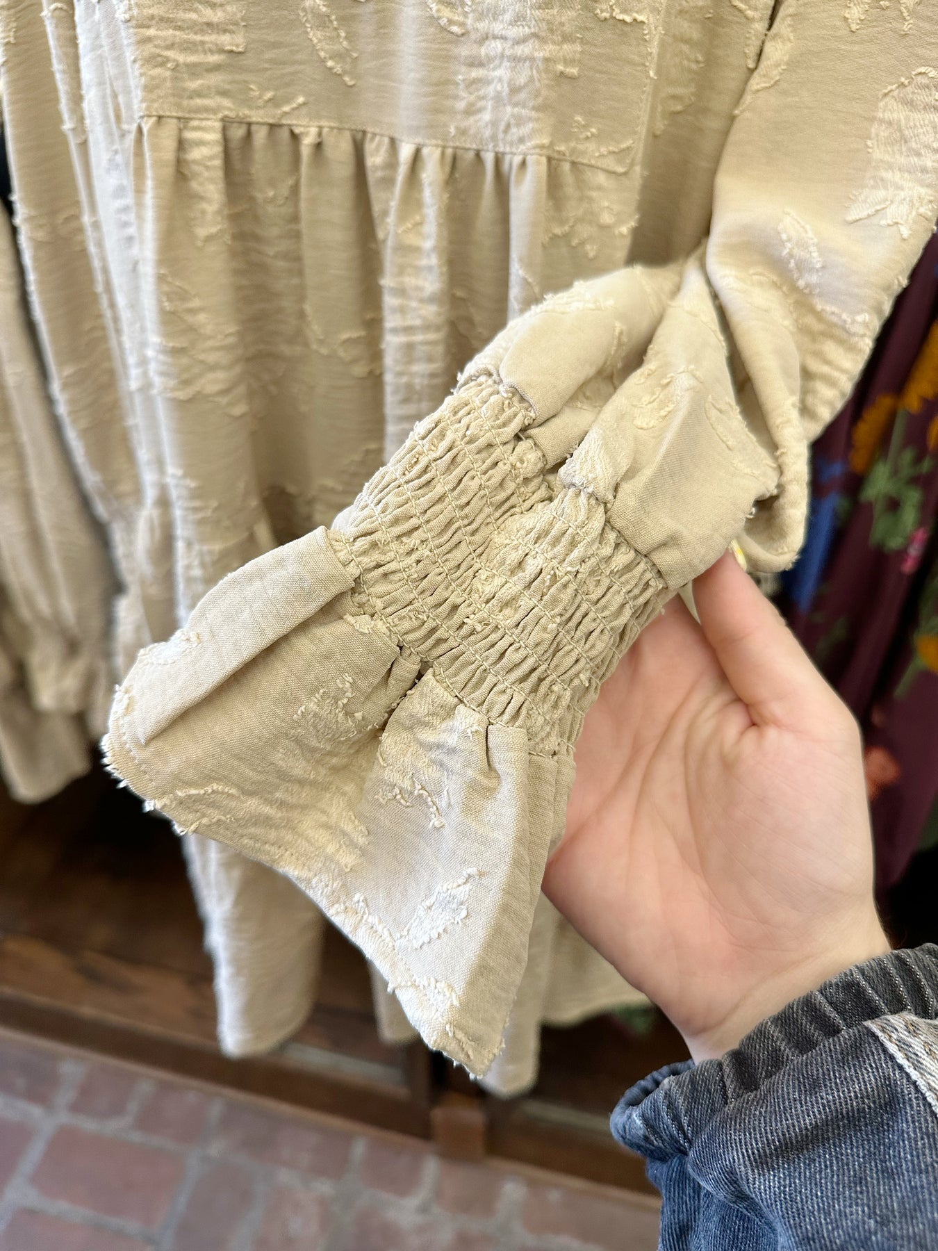 This Jacquard Tiered top in soft taupe features a flattering V-neckline with a relaxed collar for effortless style. Its long sleeves end in smocked cuffs, adding a delicate touch to the tiered babydoll silhouette that offers comfortable movement. Lightweight and unlined, it’s perfect for layering or wearing on its own for a chic, breezy look.