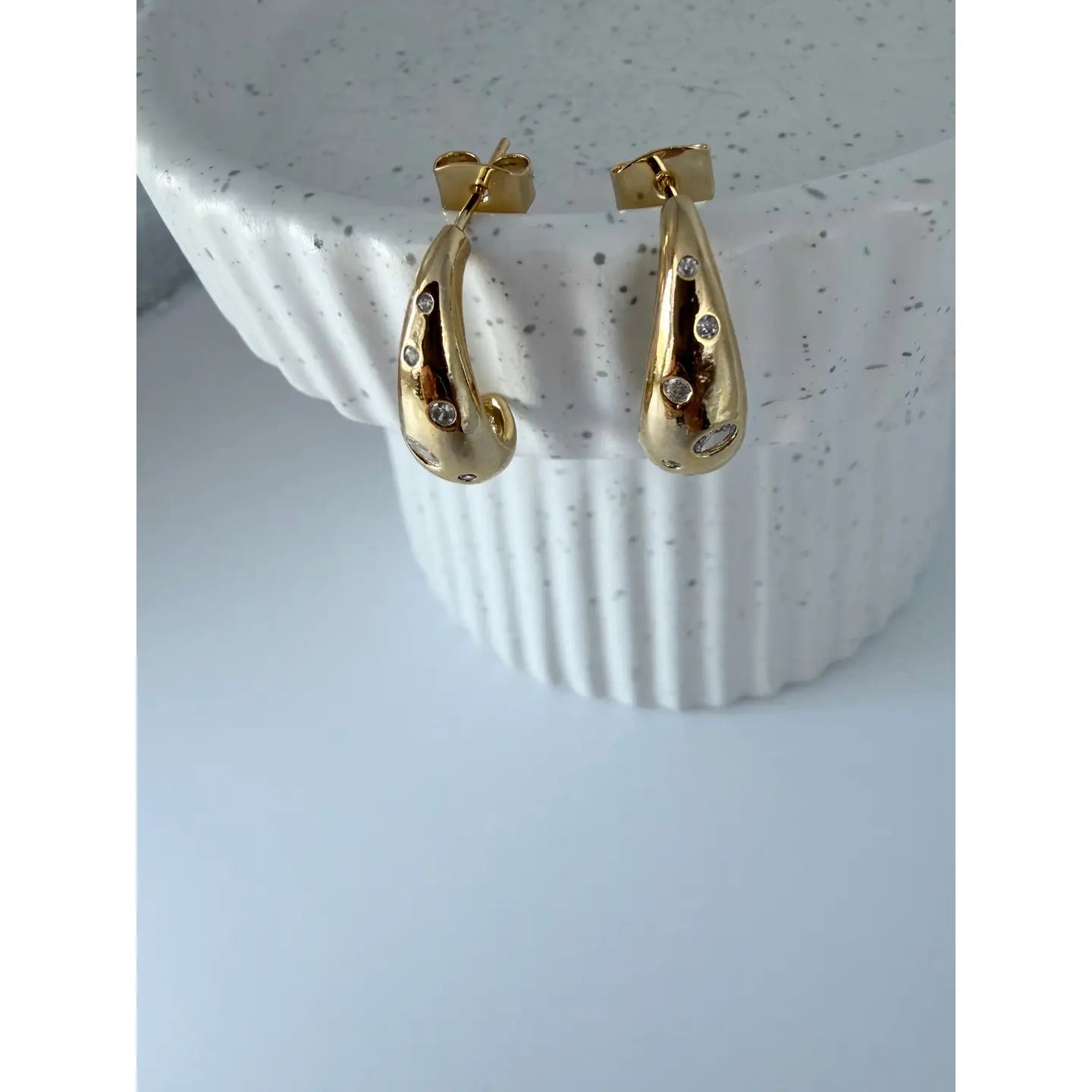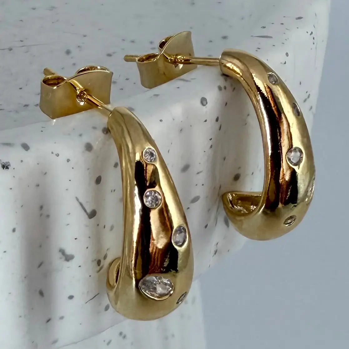 Meet the Droplet Speckle Earrings, a delicate blend of shimmer and sculptural design. These earrings feature a smooth droplet silhouette adorned with clusters of sparkling CZ stones in varying sizes, creating a speckled, light-catching effect. Effortlessly elegant and wearable for every day or elevated moments.