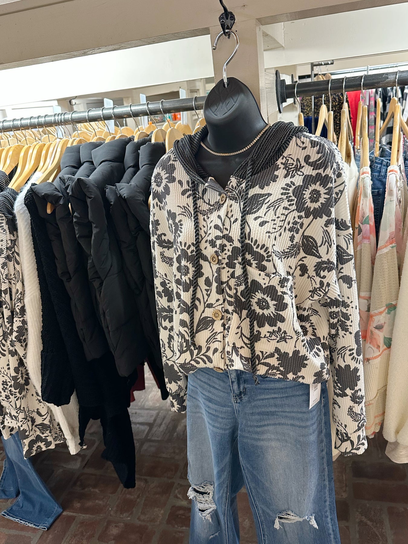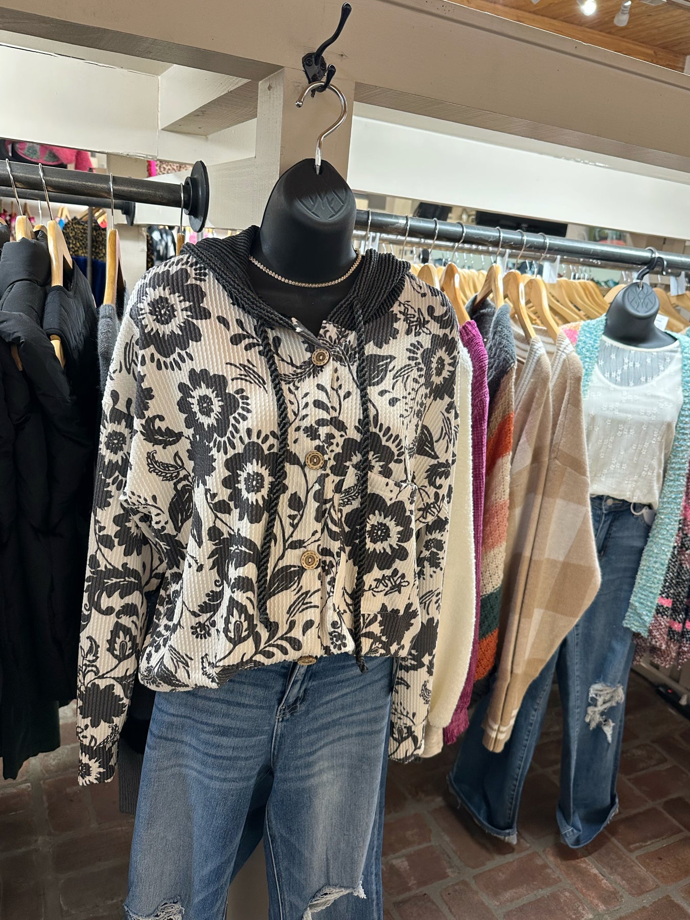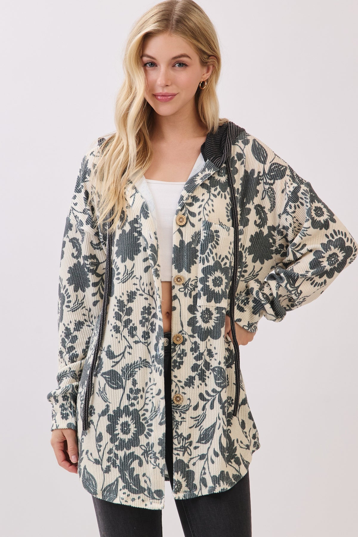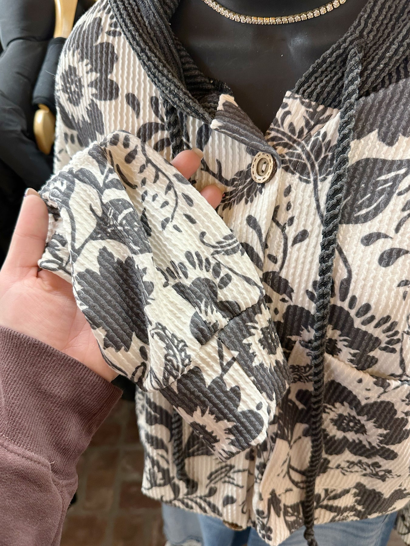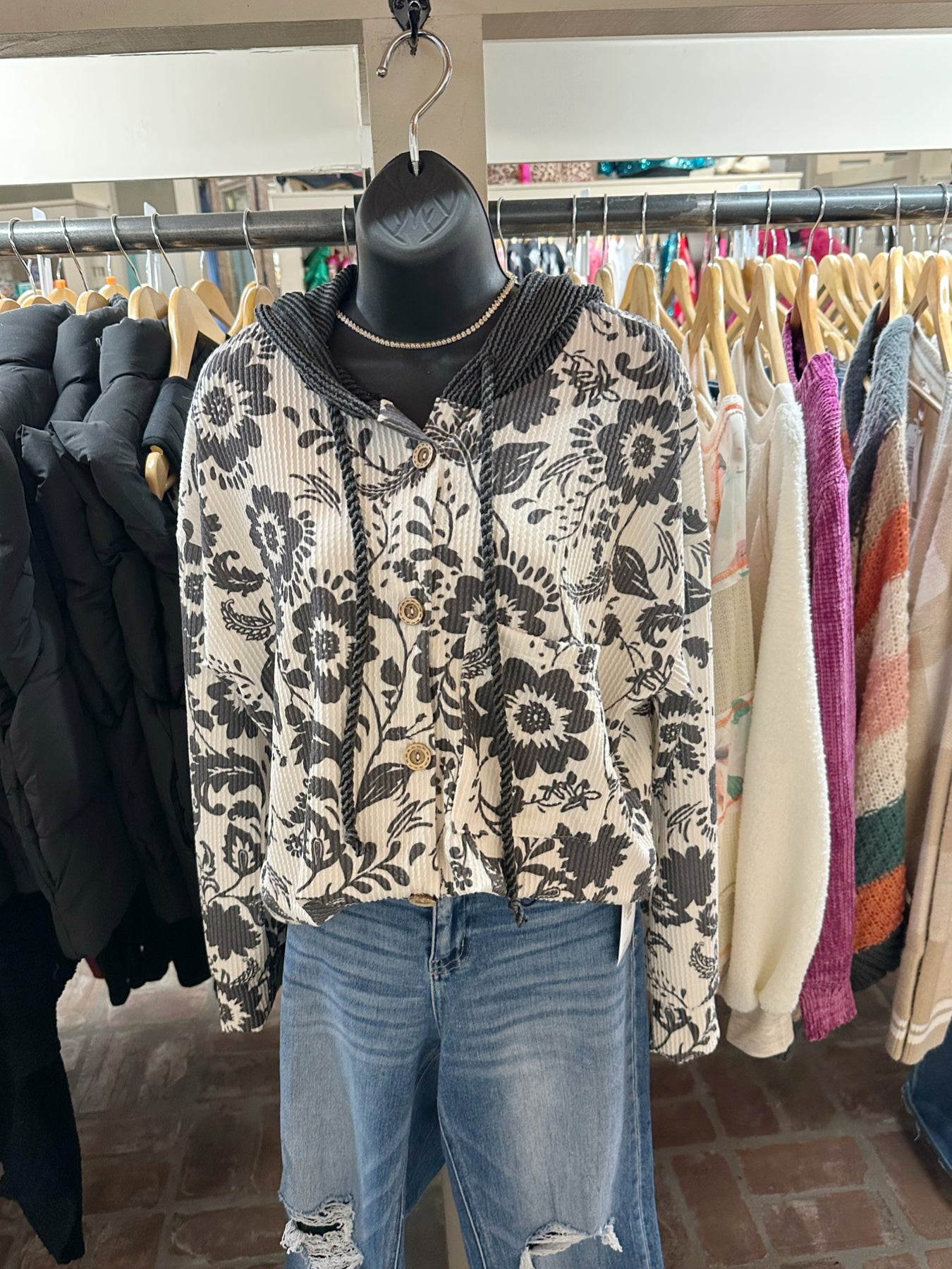 Elevate your layering game with this stunning floral ribbed knit shacket that effortlessly bridges the gap between comfort and style. The soft, textured knit fabric drapes beautifully while the eye-catching allover floral pattern makes a confident statement. A contrast drawstring hood adds modern edge, while the front button closure and relaxed fit ensure versatile wear for any season. Whether you're layering over basics or wearing solo on mild days, this piece transitions seamlessly from casual outings to weekend adventures. Timeless enough to become a wardrobe staple, bold enough to turn heads.