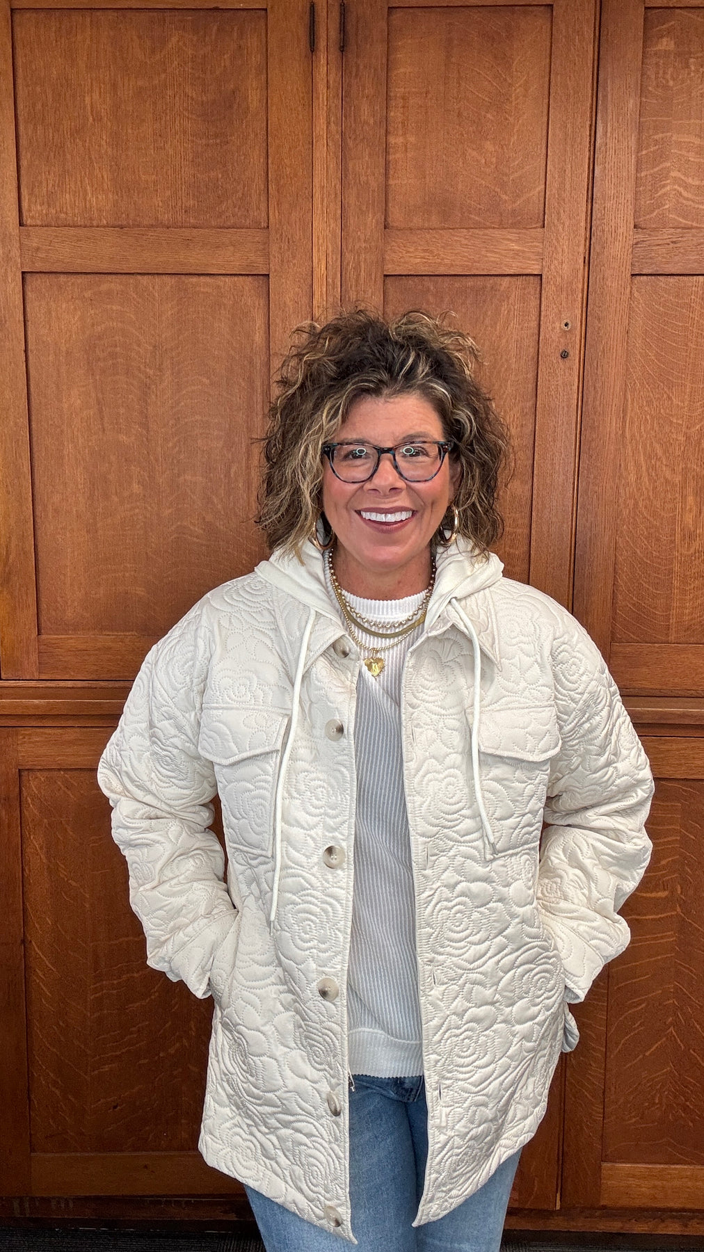 Stay warm and stylish with the Hoodie Quilted Jacket - Ivory. Featuring a cozy attached hoodie with an adjustable drawstring and a secure front zipper combined with button closures, this jacket offers versatile protection against the cold. Practical chest and side pockets keep essentials close, while the charming floral pattern adds a touch of elegance. Side slits enhance comfort and mobility, making it perfect for chilly days when you want both function and fashion.