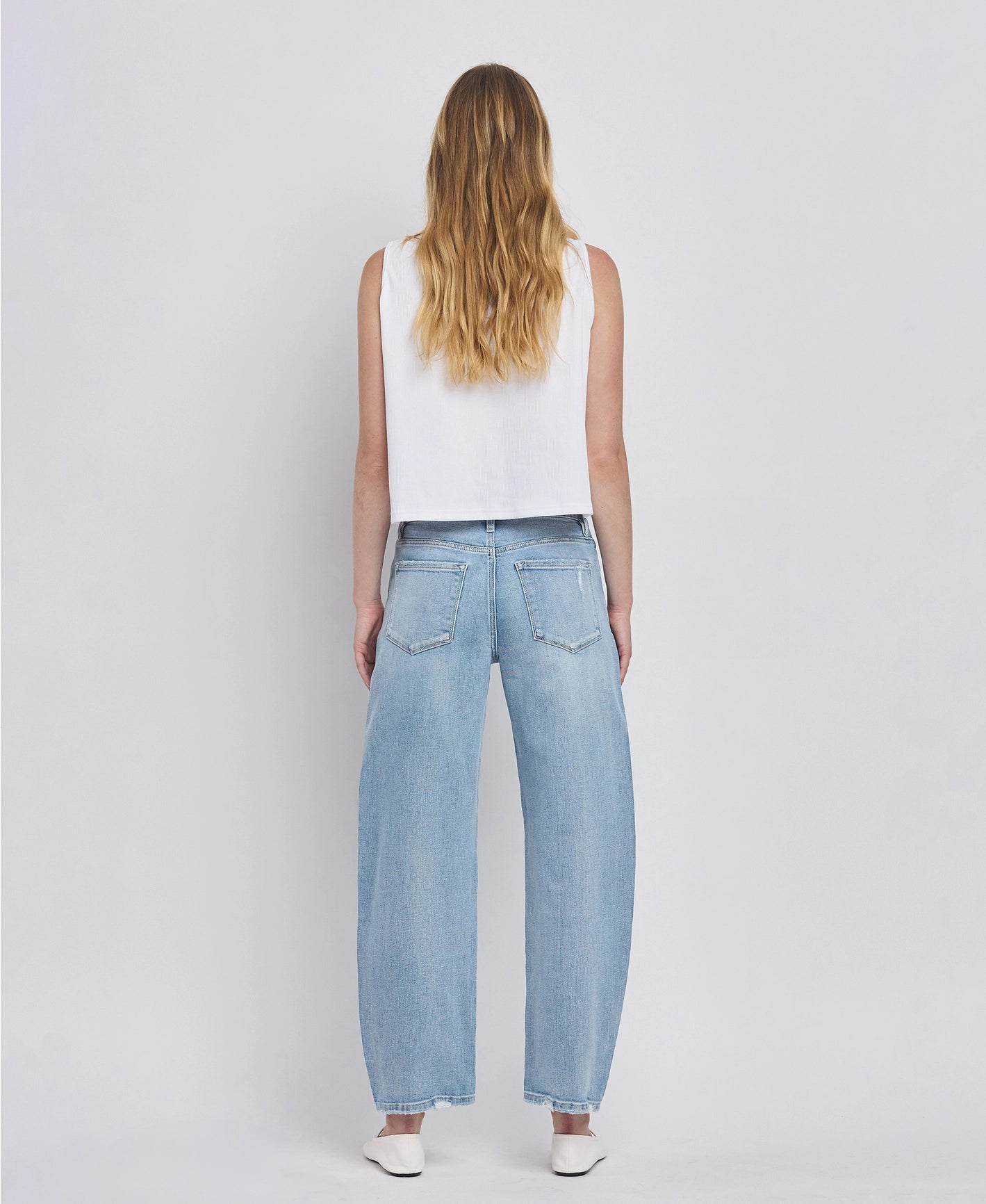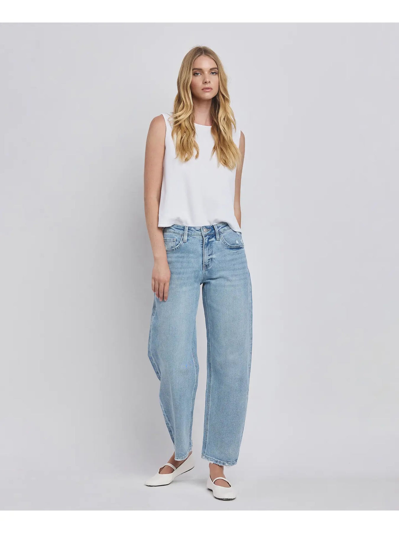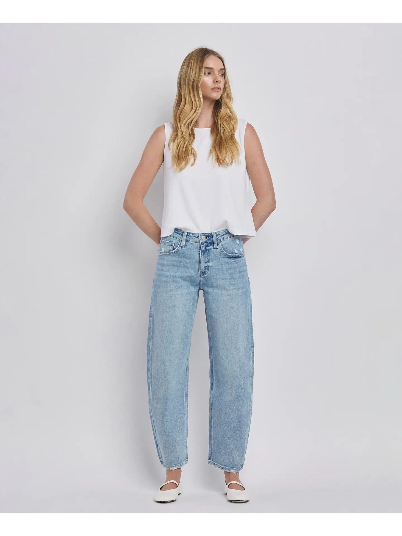 These Vervet High Rise Light Wash Barrel Leg Jeans combine comfort and style with stretch denim and a flattering high-rise waist. Featuring a trendy barrel leg cut and ankle length, they offer a modern silhouette perfect for any casual look. Lightly distressed details and five pockets add authentic character and practicality to your everyday wear. The light wash finish enhances versatility, making these jeans an essential piece for effortless outfits.