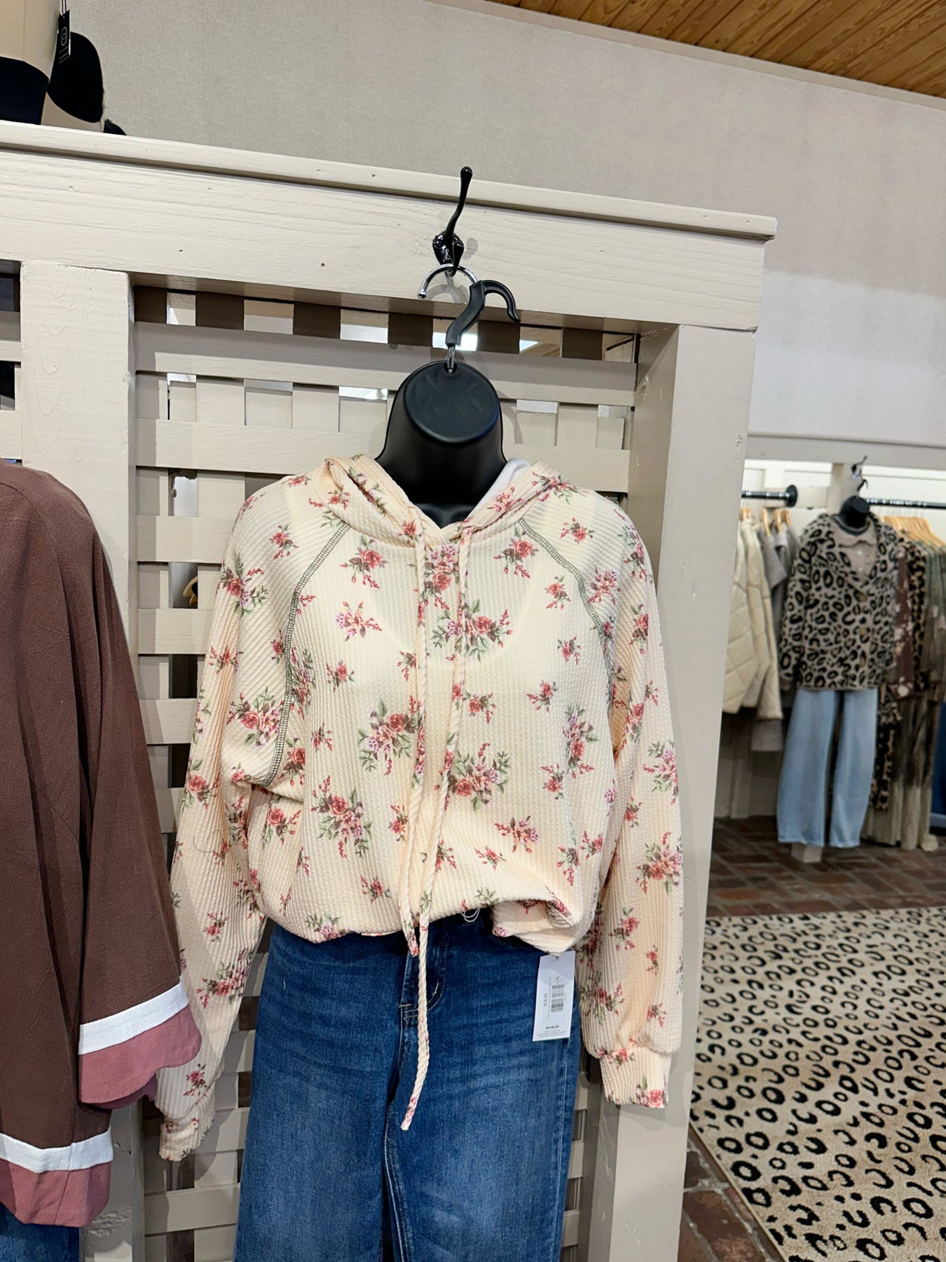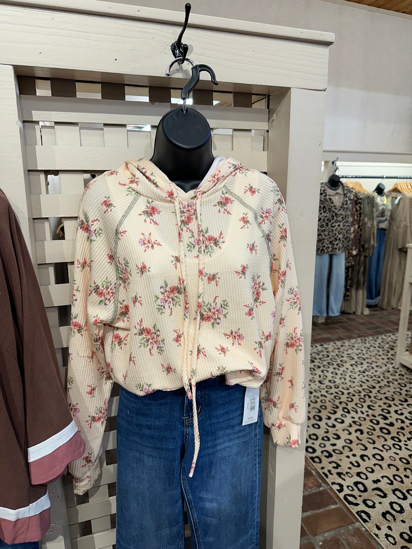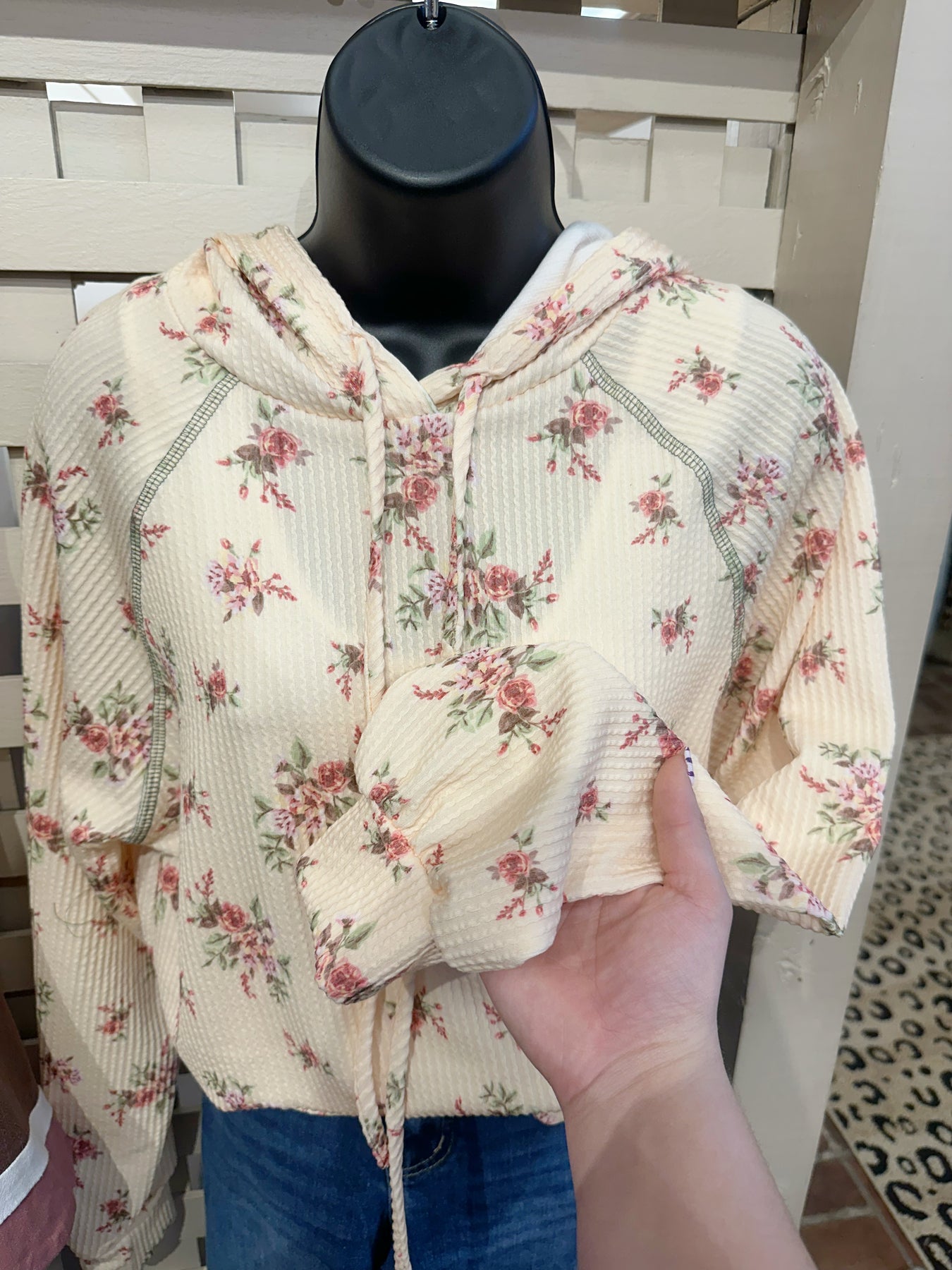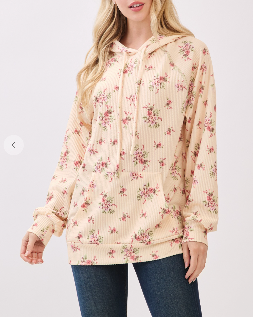 Wrap yourself in effortless comfort with this floral ribbed hoodie that perfectly balances style and coziness. The ultra-soft ribbed knit fabric feels luxurious against your skin, while the charming allover rose print adds a touch of feminine elegance to your everyday wardrobe. A relaxed fit ensures freedom of movement, and practical details like the front kangaroo pocket and adjustable drawstring hood make it ideal for layering or wearing solo. Long sleeves provide extra warmth when you need it most. Whether you're lounging at home or stepping out for casual errands, this versatile piece becomes an instant favorite you'll reach for again and again.