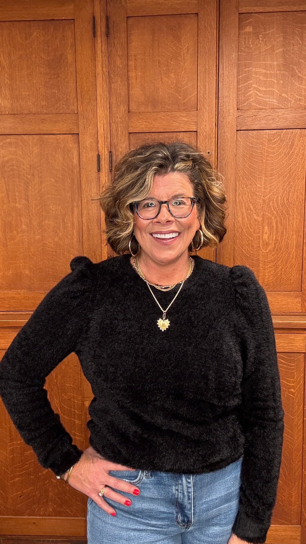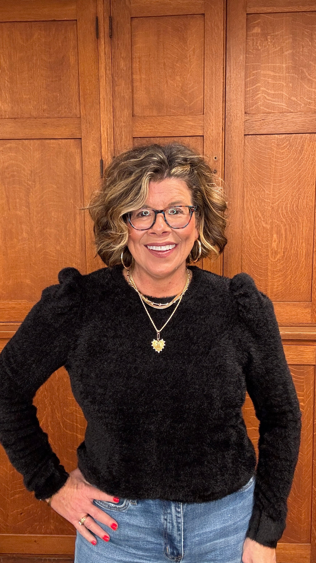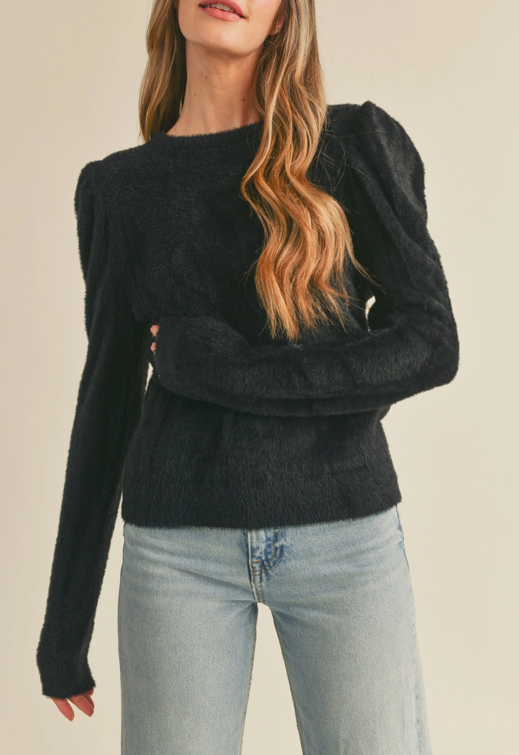 Wrap yourself in cloud-like comfort with this fuzzy puff sleeve sweater. The soft, touchable fabric feels as good as it looks, while dramatic puffed shoulders add modern flair to your everyday wardrobe. Long sleeves provide warmth and coverage, making it perfect for layering or wearing solo. A versatile black hue pairs effortlessly with your favorite jeans or skirts. Cozy, stylish, and undeniably wearable—this sweater becomes an instant go-to piece you'll reach for again and again.