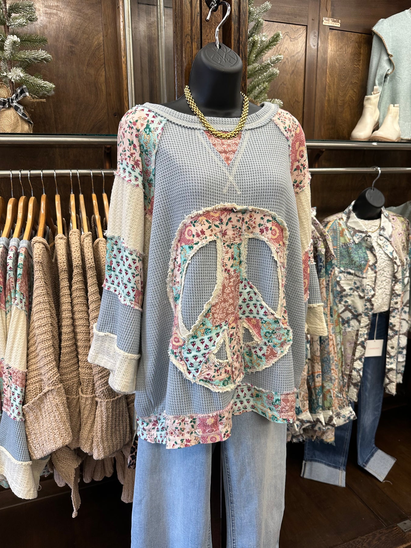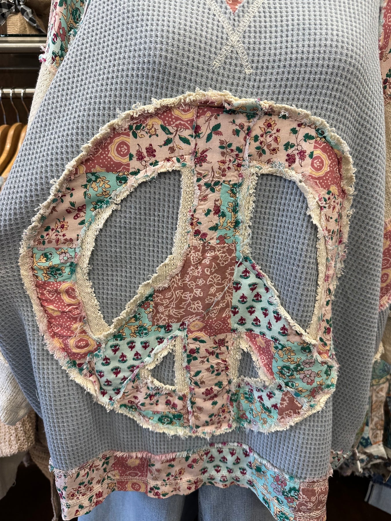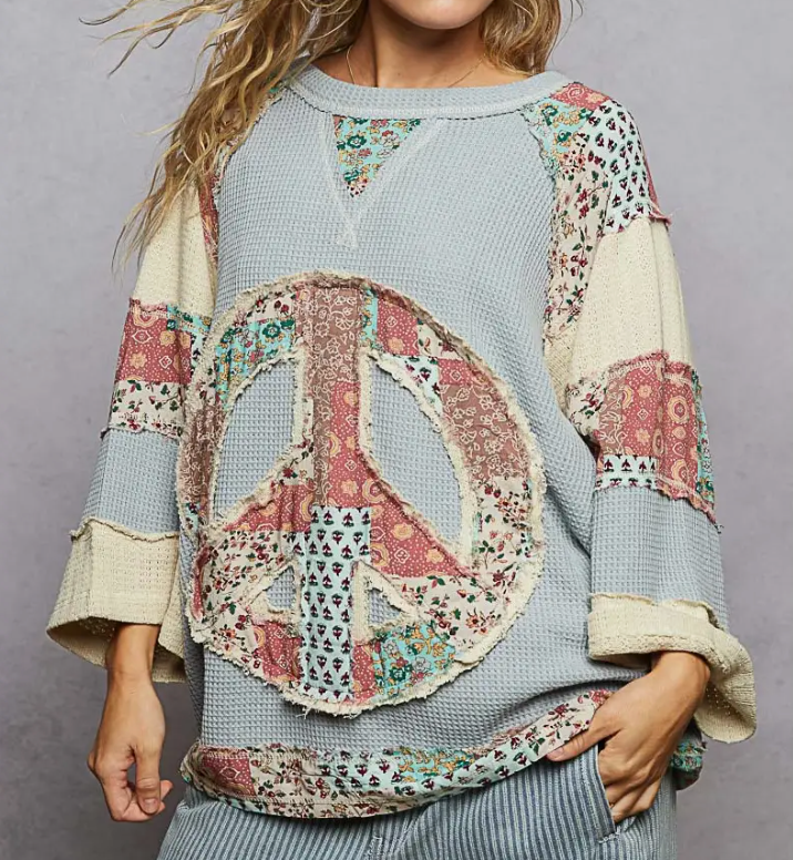 Discover comfort meets style in this powder blue thermal knit top. Featuring a relaxed round neck, three-quarter sleeves, and a meaningful peace patch detail, it's designed for everyday versatility. Side slits and vintage washing give it an effortlessly cool edge, while the roomy fit ensures all-day ease. Perfect for layering or wearing solo.