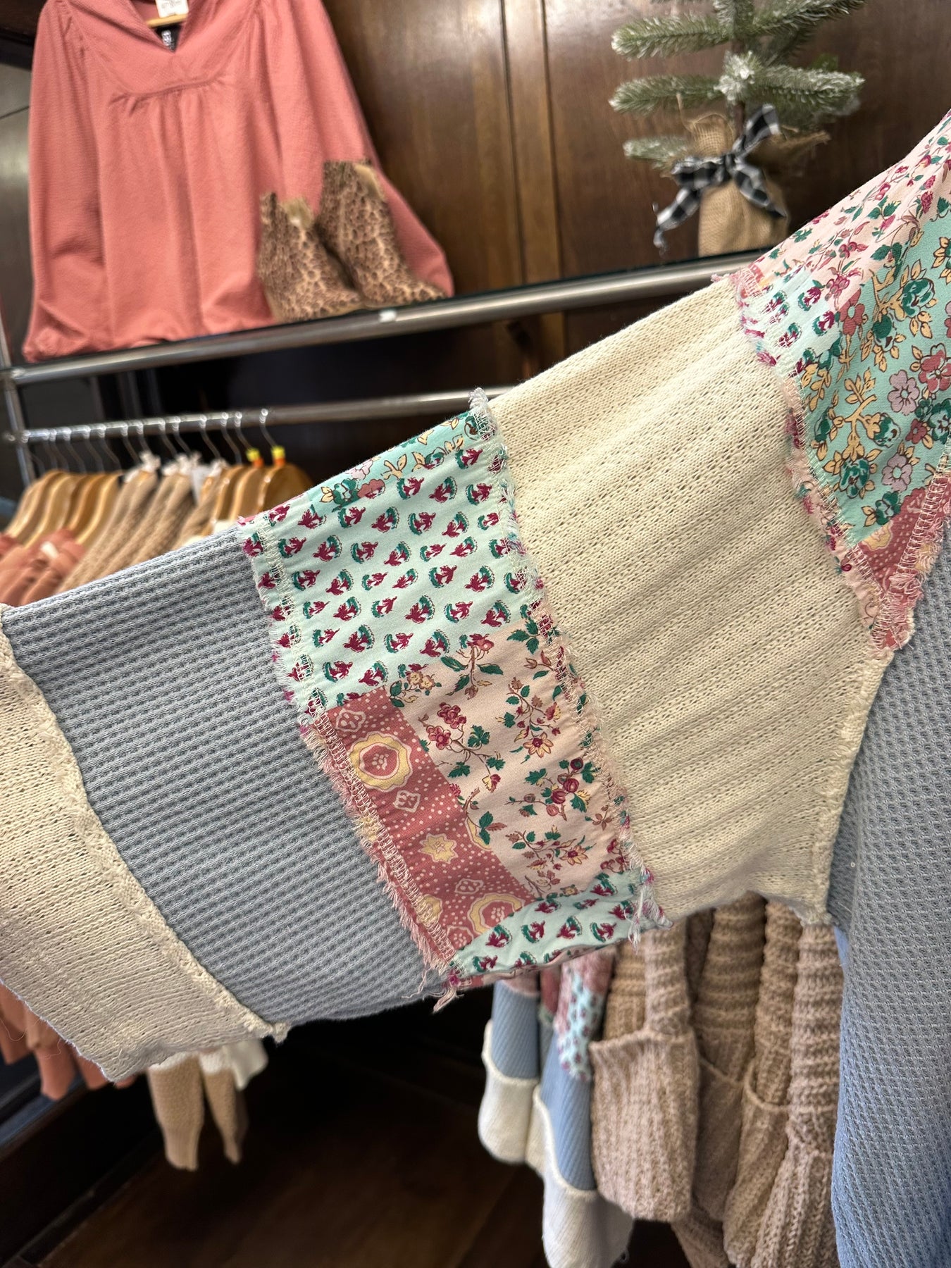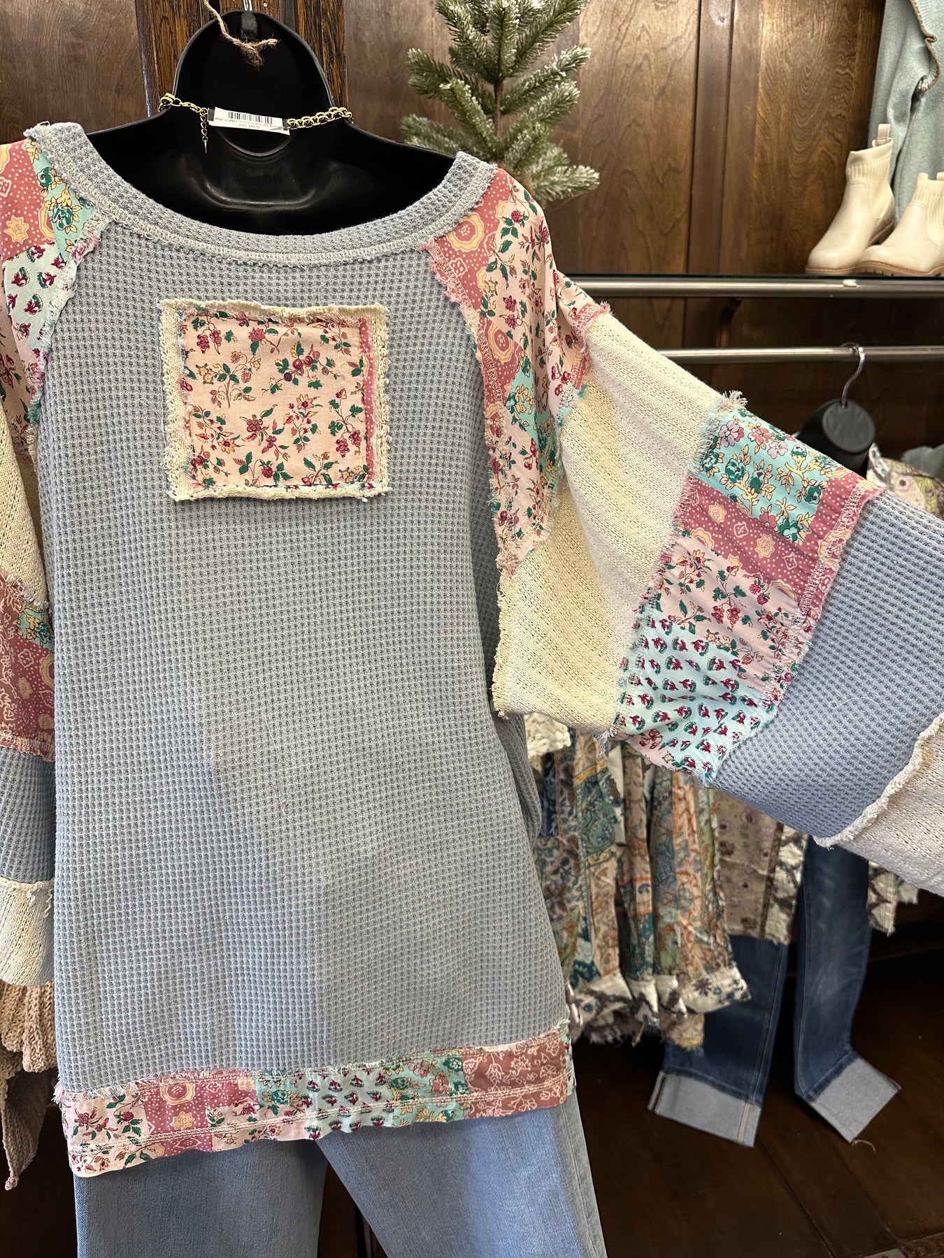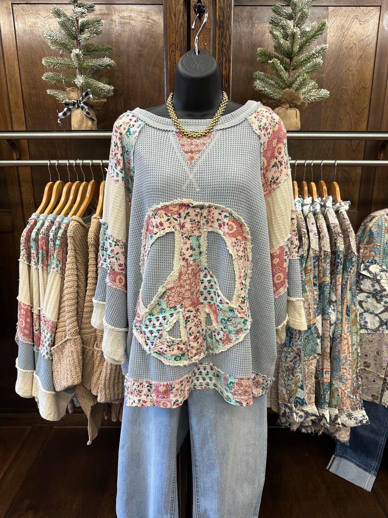 Discover comfort meets style in this powder blue thermal knit top. Featuring a relaxed round neck, three-quarter sleeves, and a meaningful peace patch detail, it's designed for everyday versatility. Side slits and vintage washing give it an effortlessly cool edge, while the roomy fit ensures all-day ease. Perfect for layering or wearing solo.