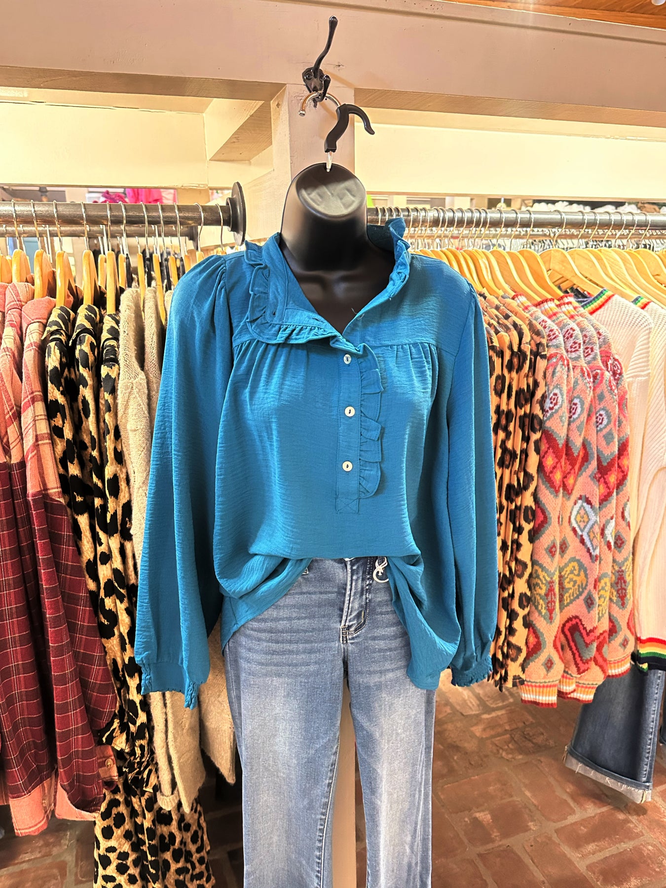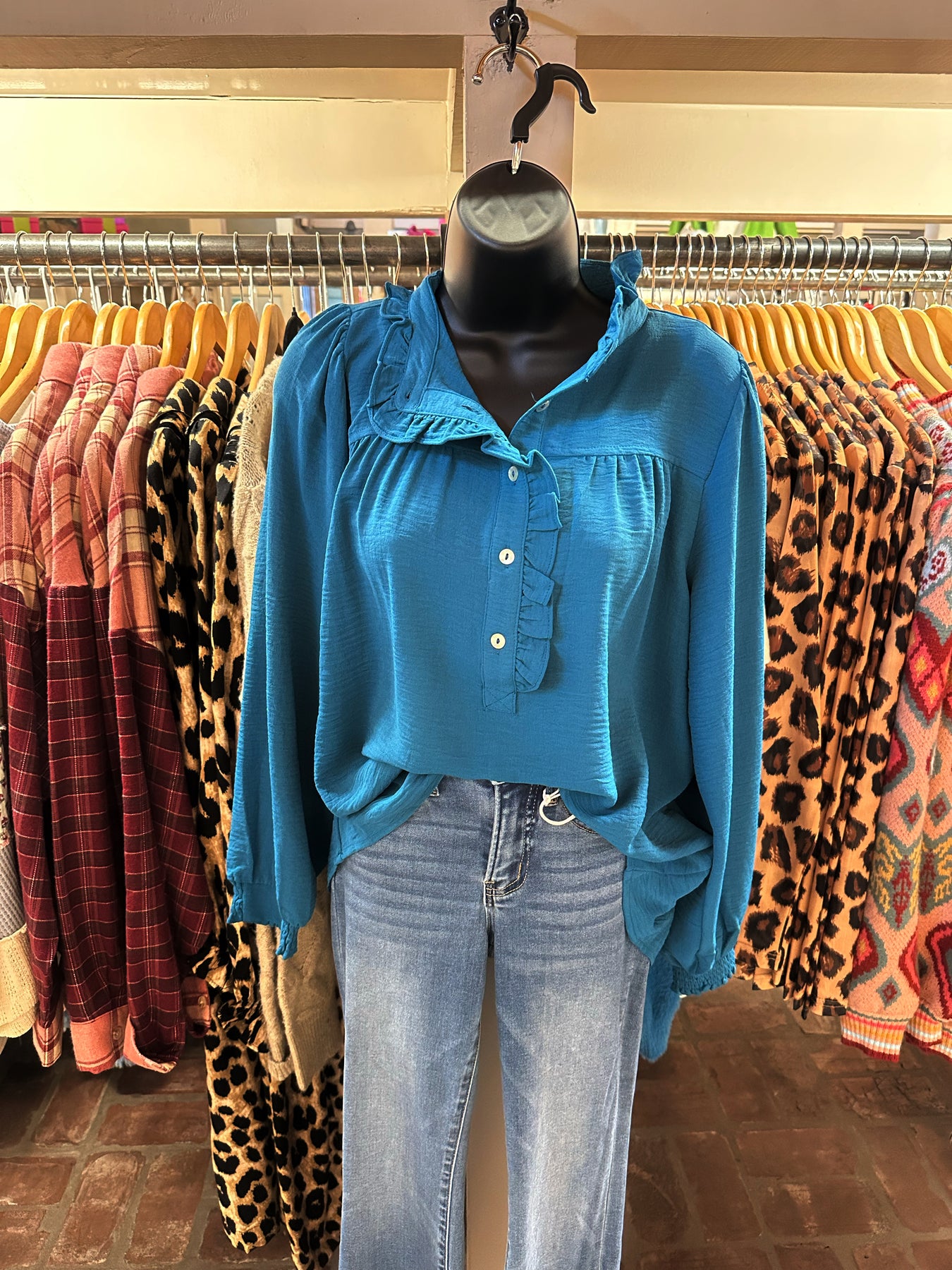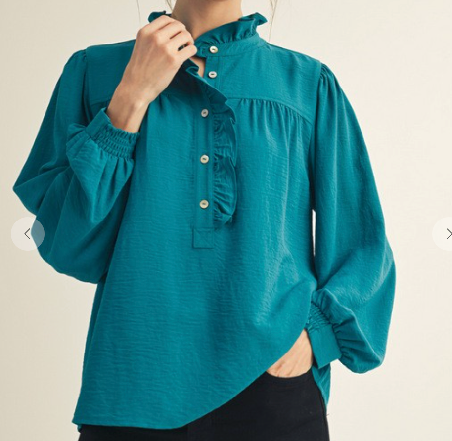 Elevate your holiday wardrobe with this sophisticated Ruffle Accent Blouse in classic Teal. Featuring long sleeves and a button-up front, this piece combines timeless elegance with modern flair. The standout ruffled mock neckline adds dimension and visual interest, while the textured solid fabric provides depth and texture that photographs beautifully. Perfect for festive gatherings, office parties, or elevated casual occasions, this blouse transitions seamlessly from day to night. The structured design flatters multiple body types, making it a versatile essential that deserves a permanent place in your closet. Dress it up with tailored trousers or down with your favorite jeans for effortless style.
