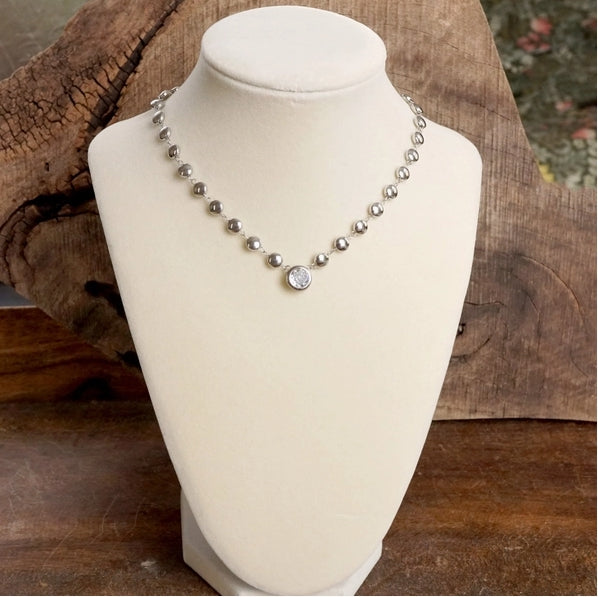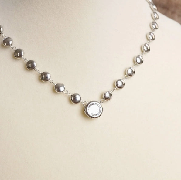 A beautiful twist on the classic neckline necklace, this Clear Crystal Bezel Pendant Dot Chain Necklace combines timeless elegance with modern flair. Available in gold or silver tone, its delicate dot chain and clear crystal bezel pendant make it the perfect piece to complement any outfit.