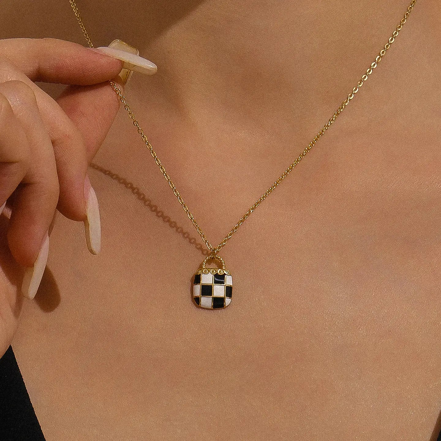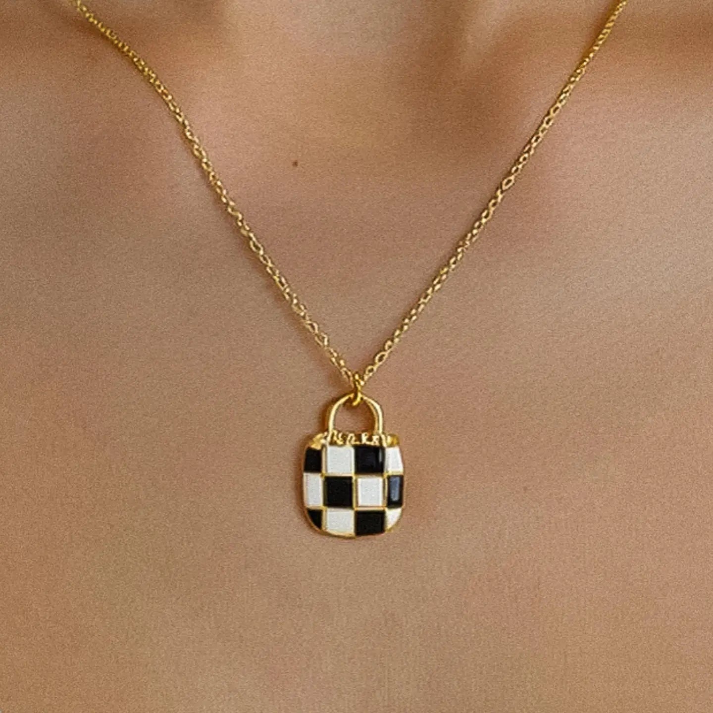 Make a bold statement with the Onrae Checkered Pendant Necklace. Its distinctive geometric pattern adds instant character to your look, whether dressed up or down. A modern essential that transforms any ensemble.