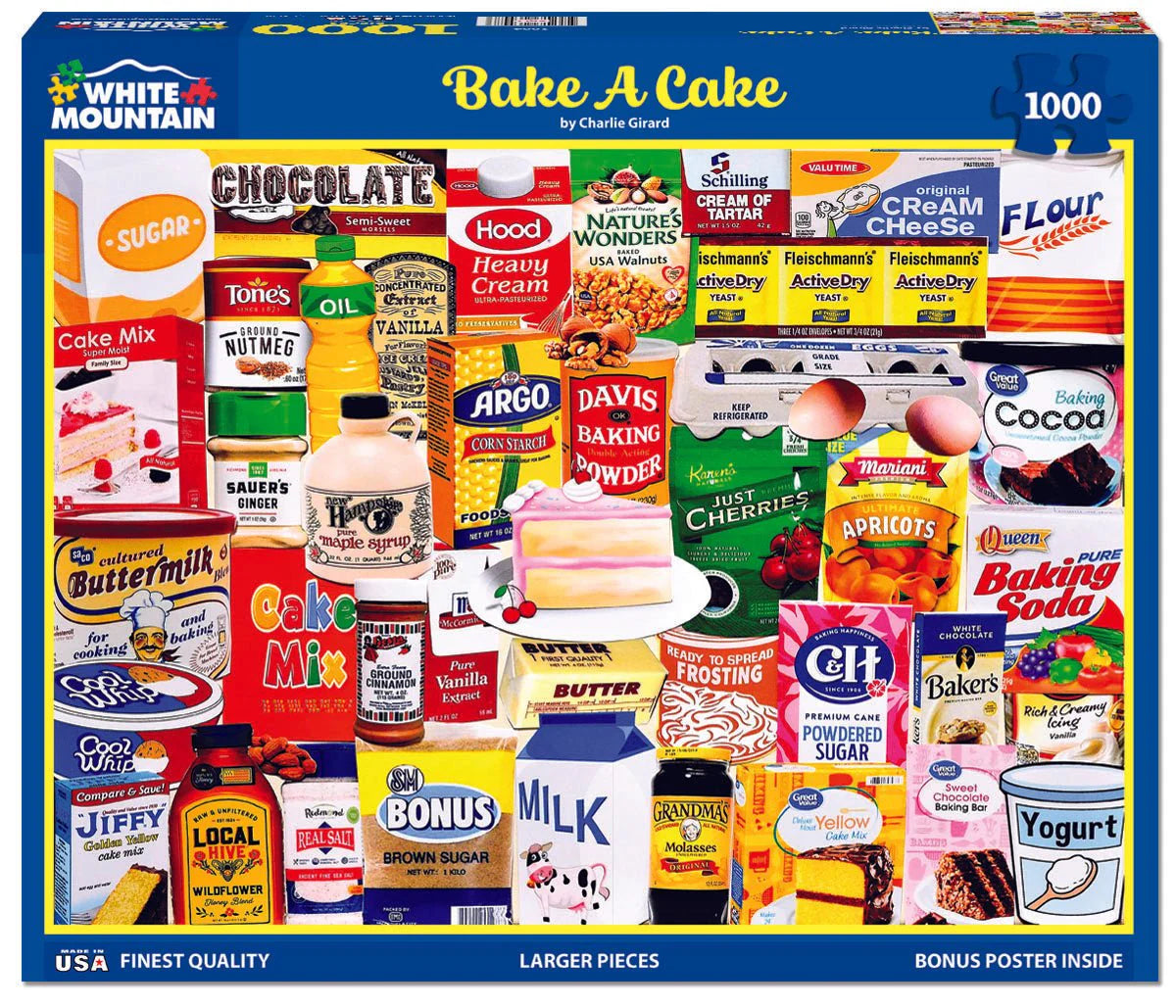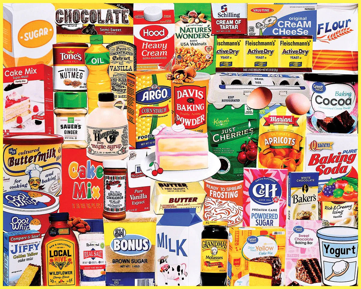 Cheesecake or fruit cake. From a box or from scratch. Honey or sugar. No matter what you favor, no matter the add in’s, the smell of a cake baking calls one and all. Artist Charlie Girard gathered images that will take you bake to the kitchen helping your mom bake cupcakes and licking the spoon in this 1000pc collage style jigsaw puzzle. Finished size 24" x 30".