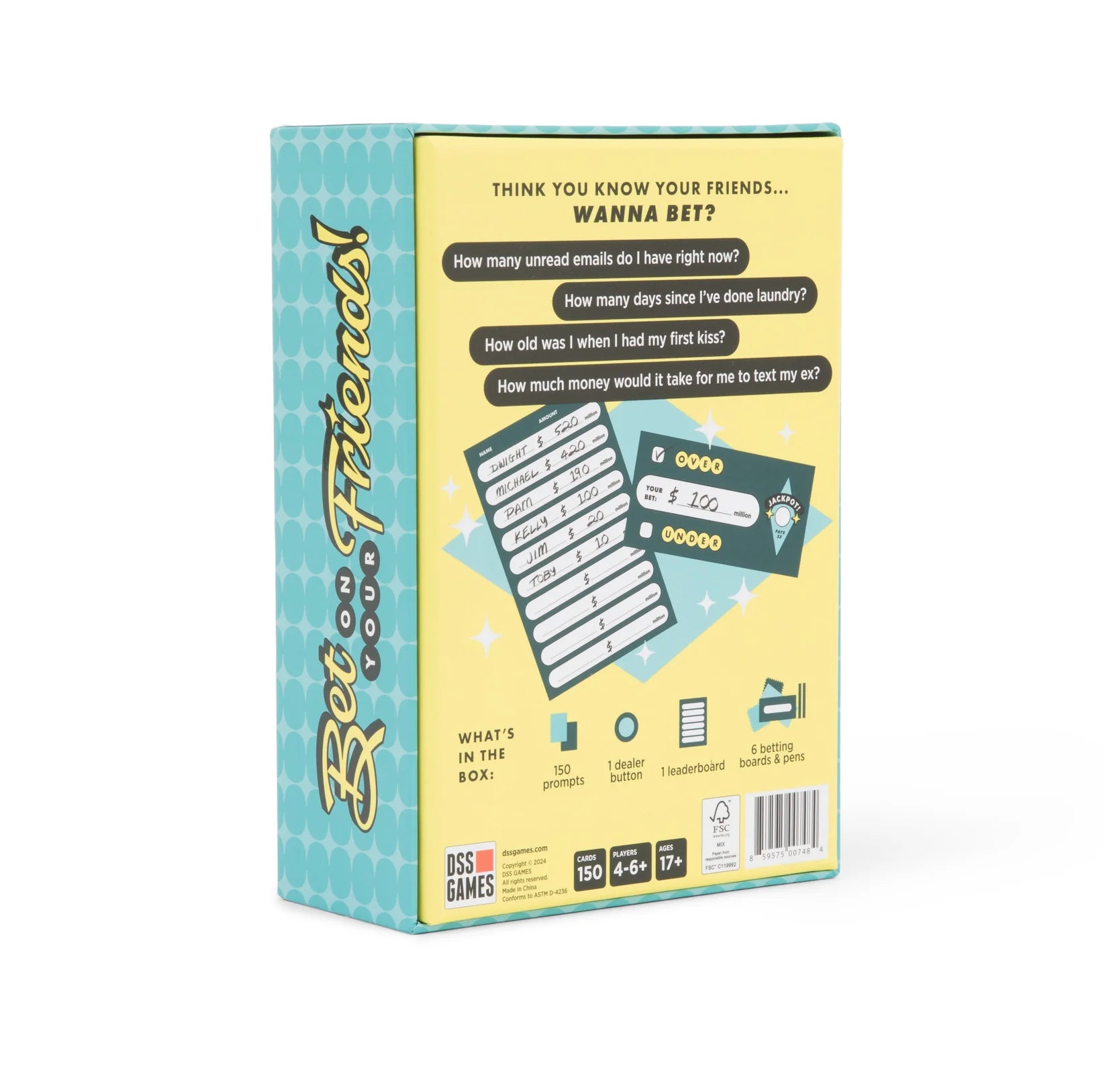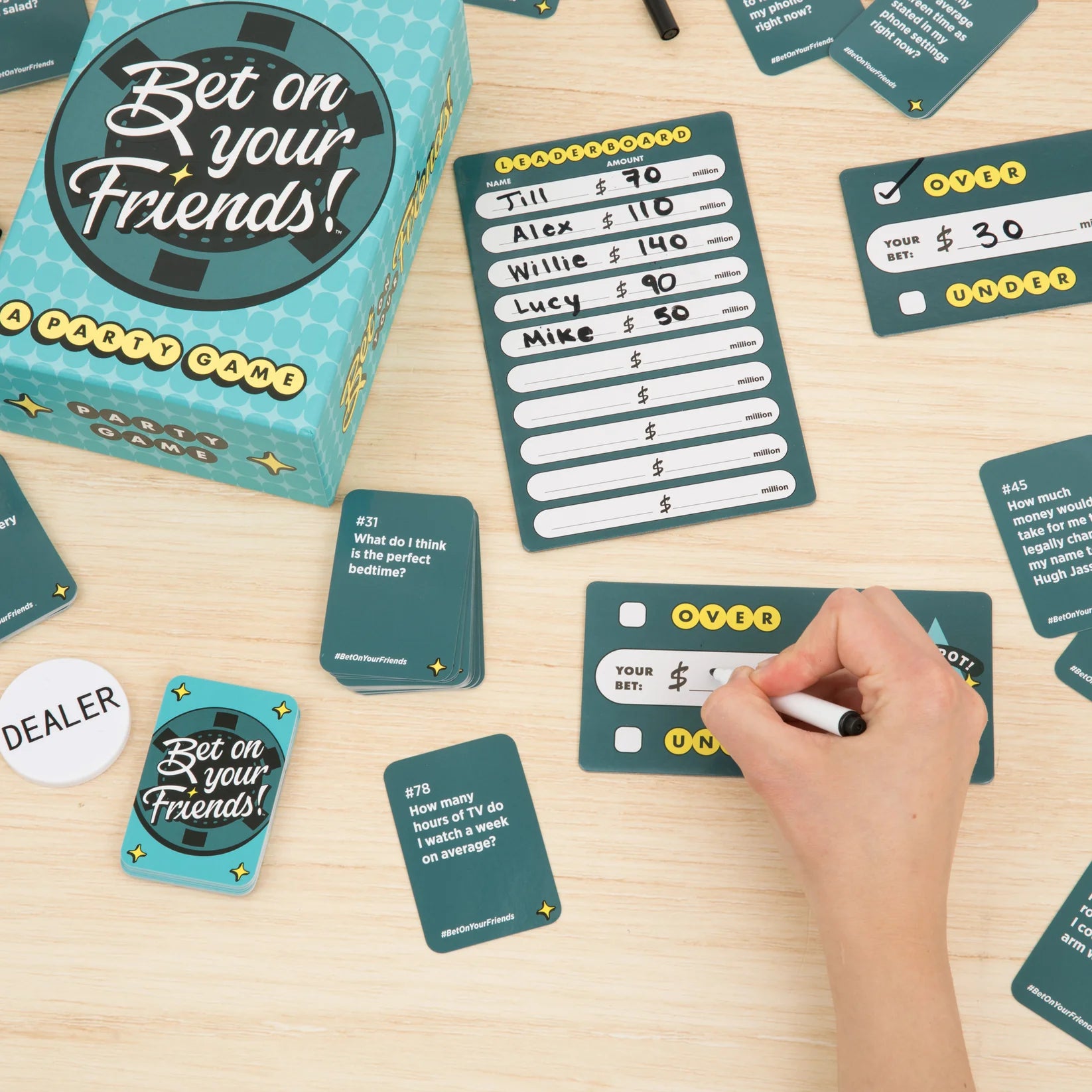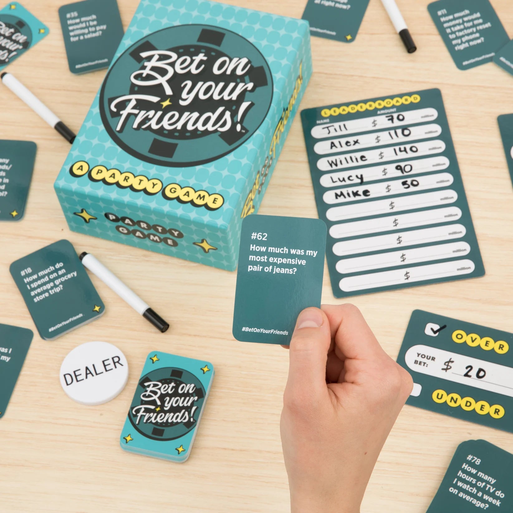 • BOX INCLUDES: 150 prompt cards, 1 dealer button, 1 leaderboard, plus 6 betting boards, markers, and cleanup cloths.