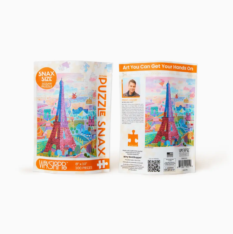 Take a break and pick up some snax, Puzzle Snax. This sustainably made jigsaw puzzle is great for puzzlers of all ages. The art is fantastic and sure to bring a smile to all who engage. A resealable pouch is great for storing the pieces, or frame the completed puzzle in any 8" x 10" frame.