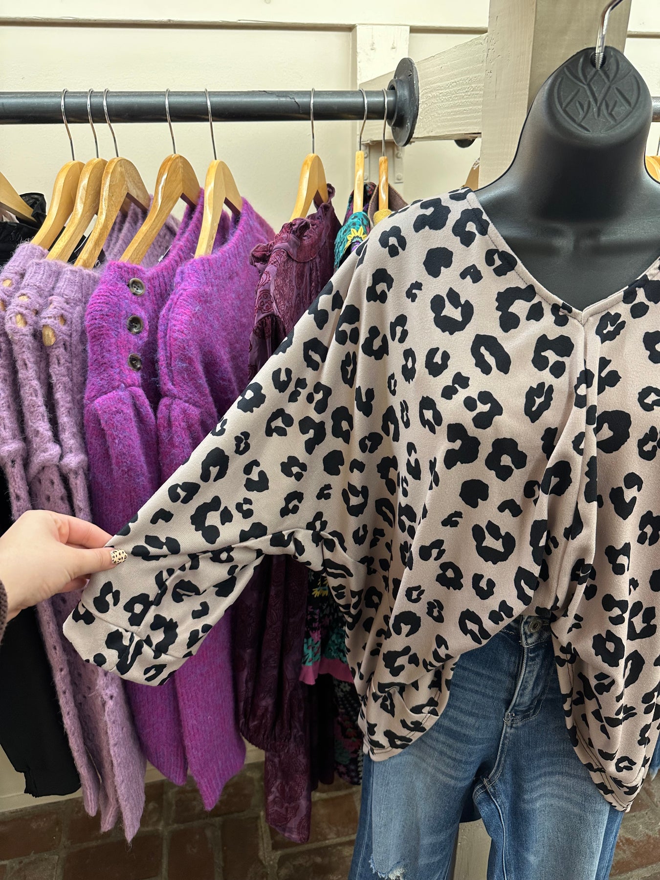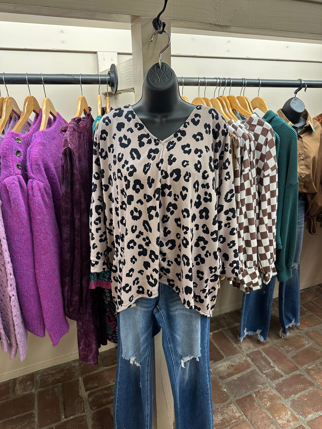 Elevate your everyday look with this chic leopard print oversized top. Featuring a relaxed fit, flattering V-neckline, and wide 3/4 length sleeves, this piece offers both comfort and style. Perfect for pairing with jeans or leggings, it's a versatile wardrobe staple that transitions effortlessly from casual daywear to a night out. The soft fabric ensures all-day comfort while the bold print adds a trendy, confident touch.