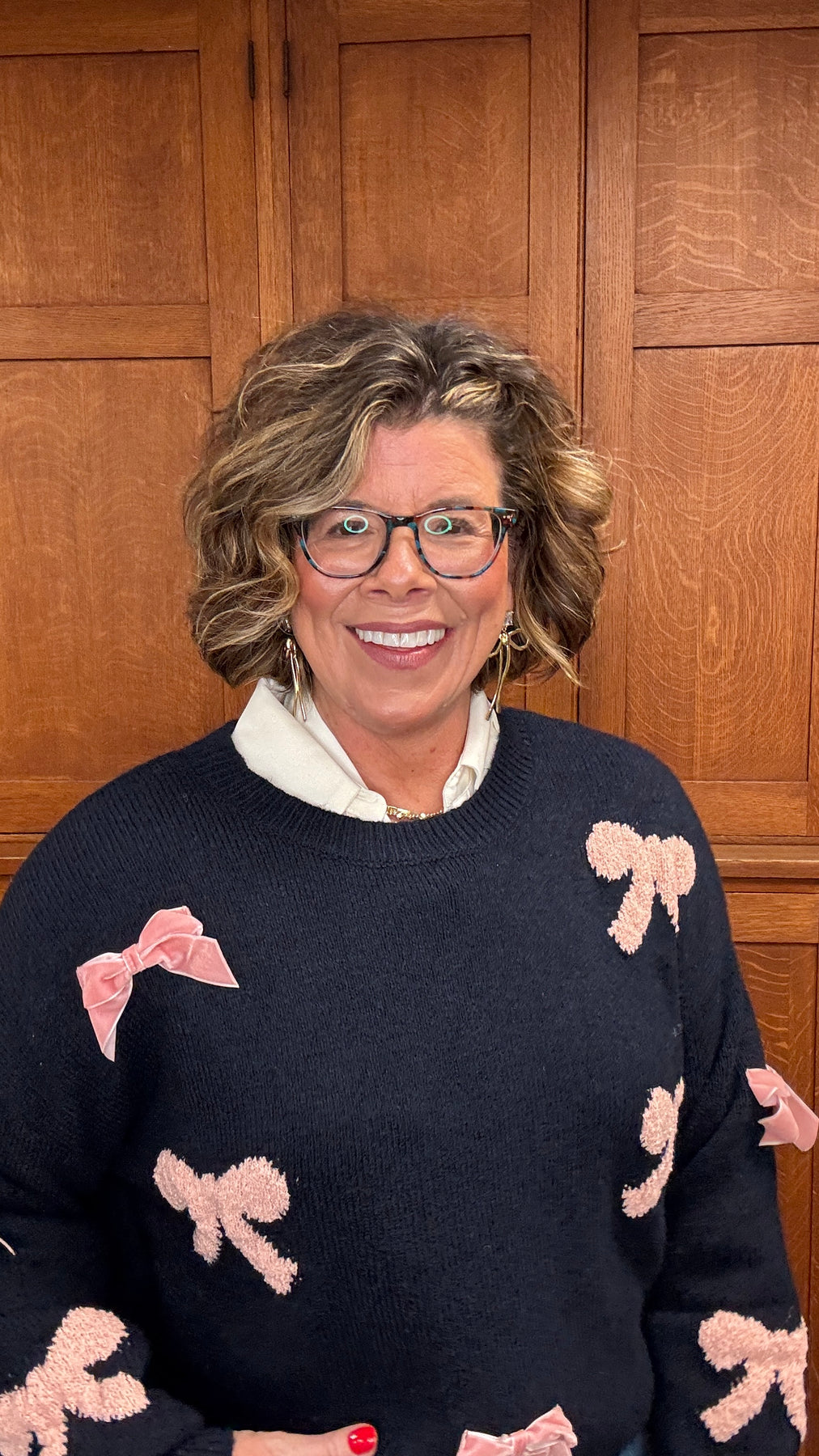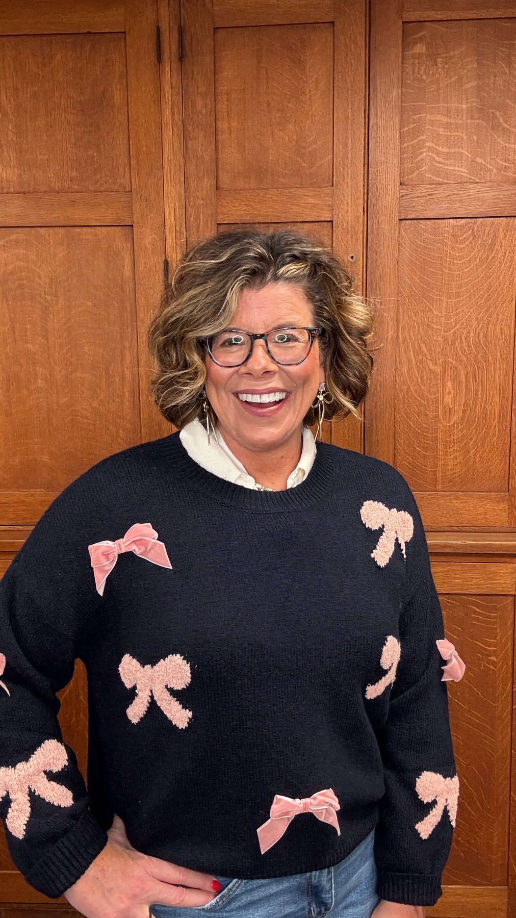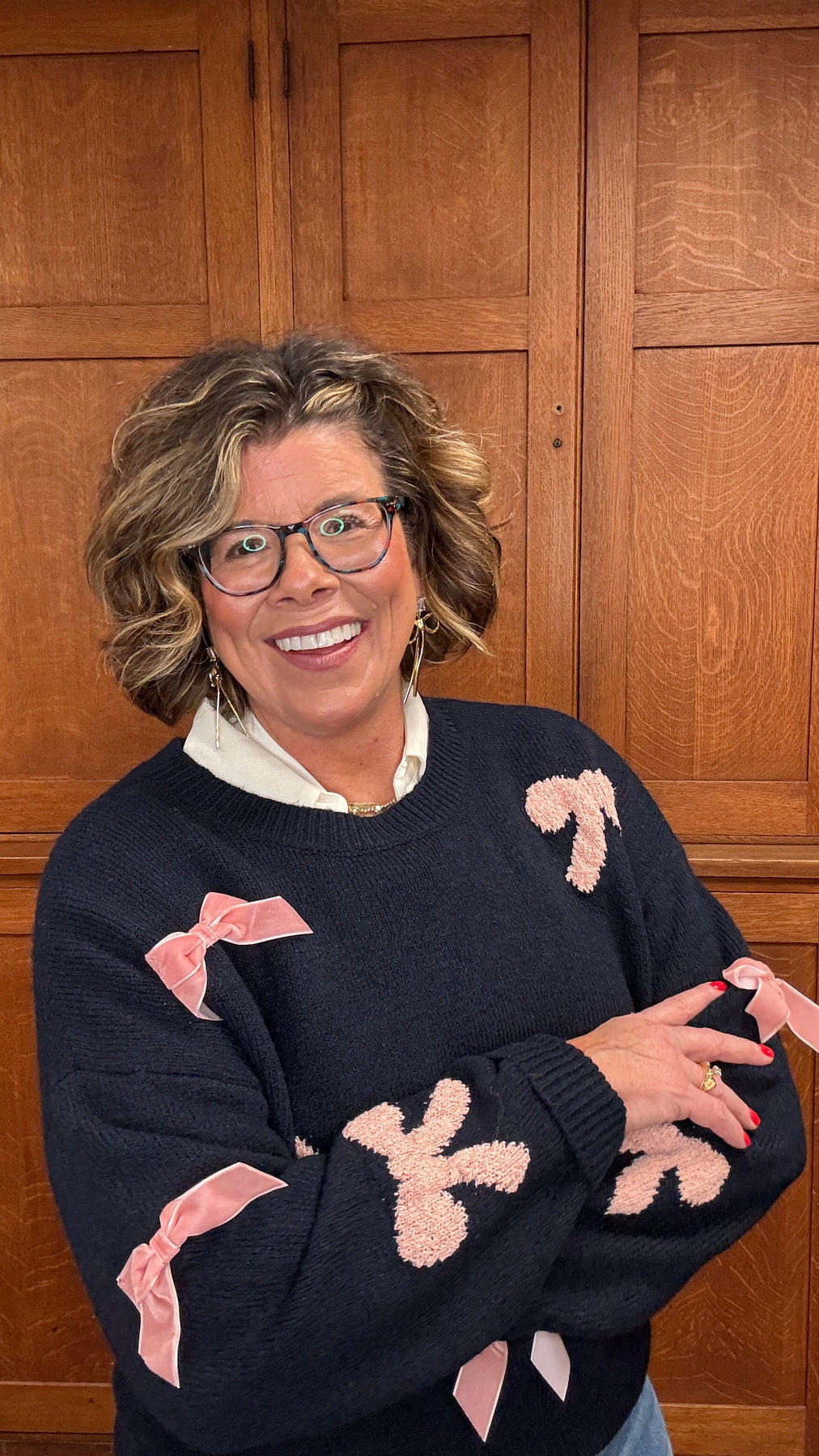 Elevate your everyday style with this charming Pink Bow Navy Sweater, a versatile piece that effortlessly blends comfort and sophistication. Featuring a classic crew neckline and relaxed fit, this knit pullover drapes beautifully with drop shoulders for a modern silhouette. The delicate bow pattern and bow detail add a touch of feminine elegance, while long sleeves provide warmth without bulk. Unlined for breathable comfort, this sweater transitions seamlessly from casual outings to cozy nights in. A timeless essential that deserves a permanent spot in your wardrobe.