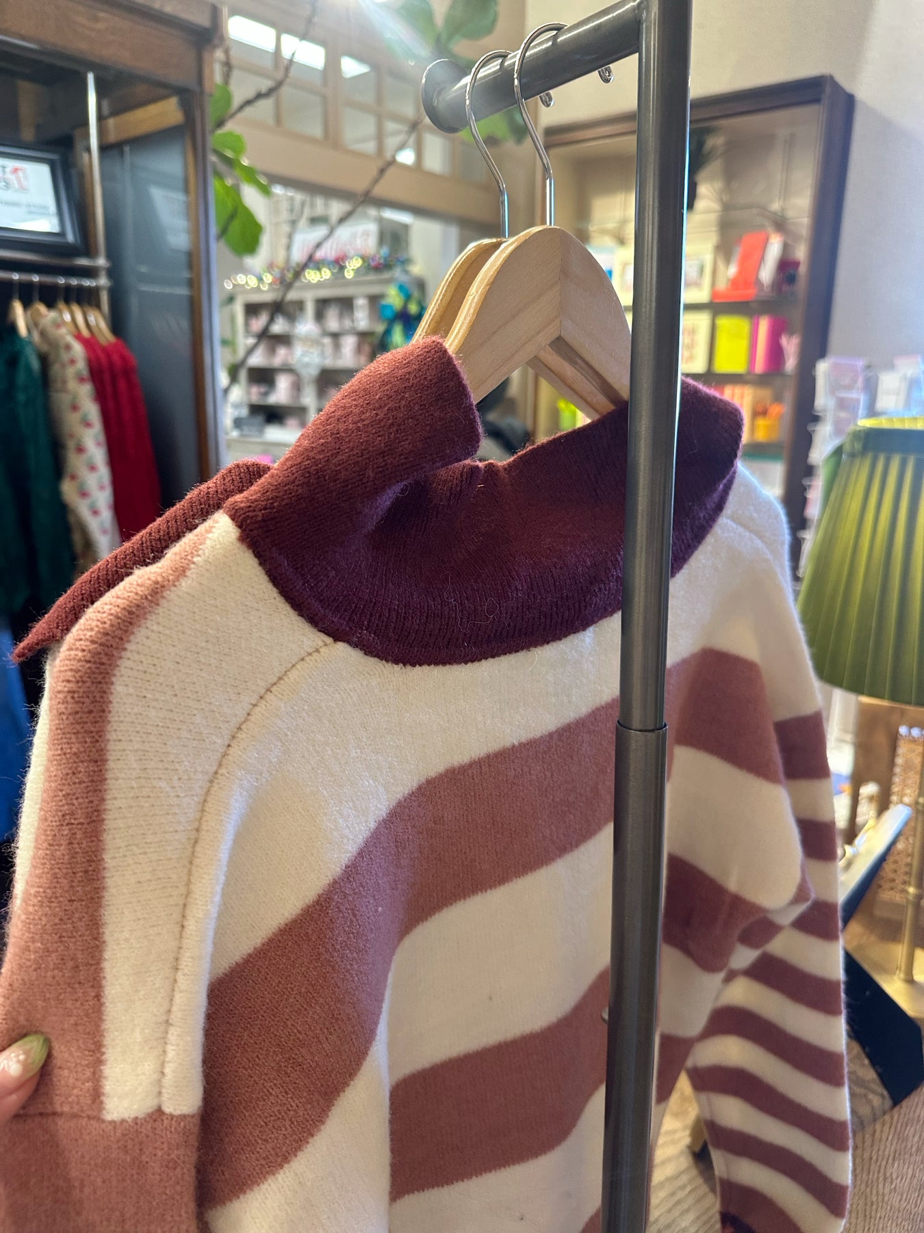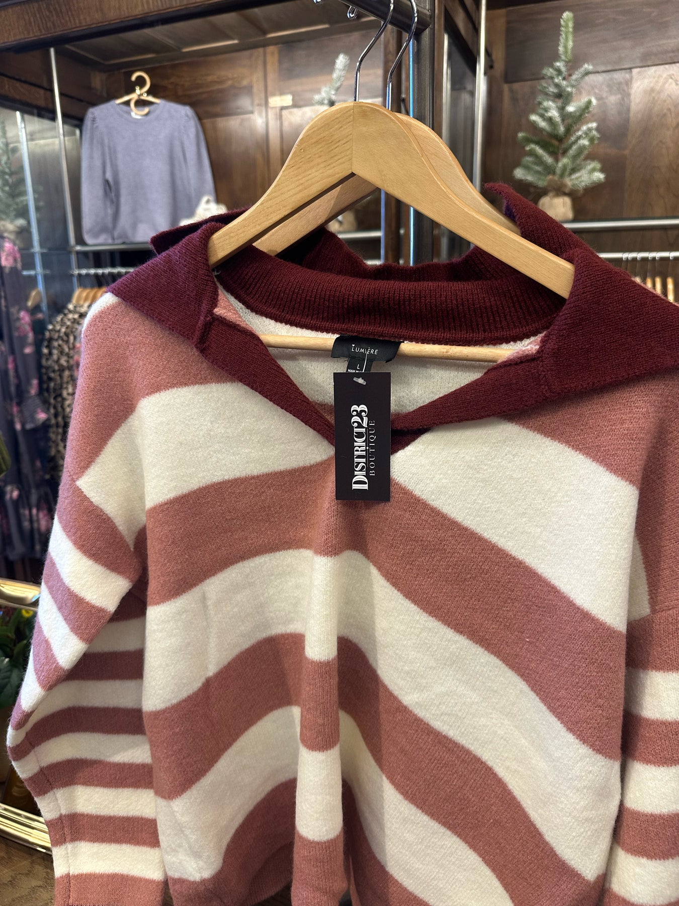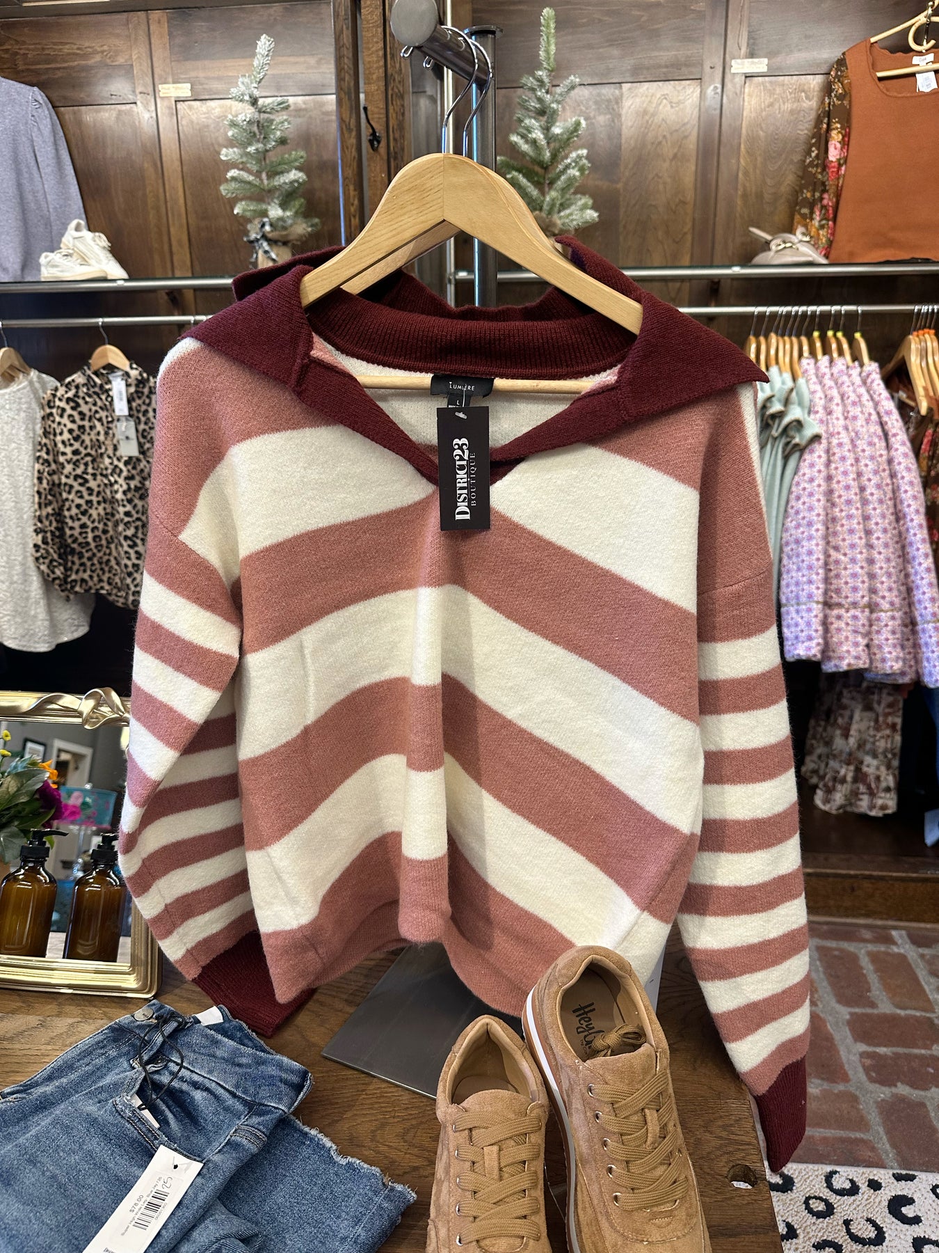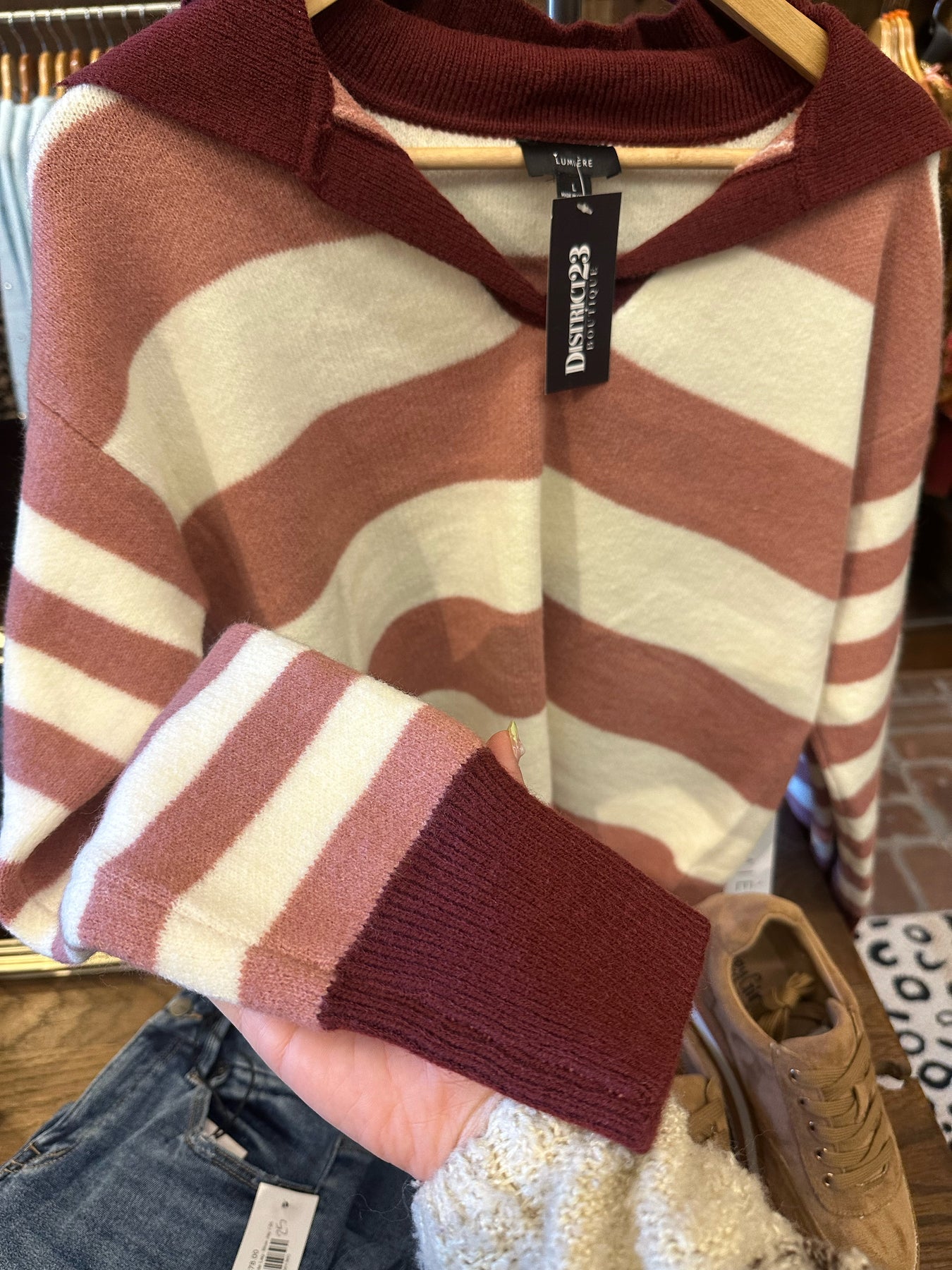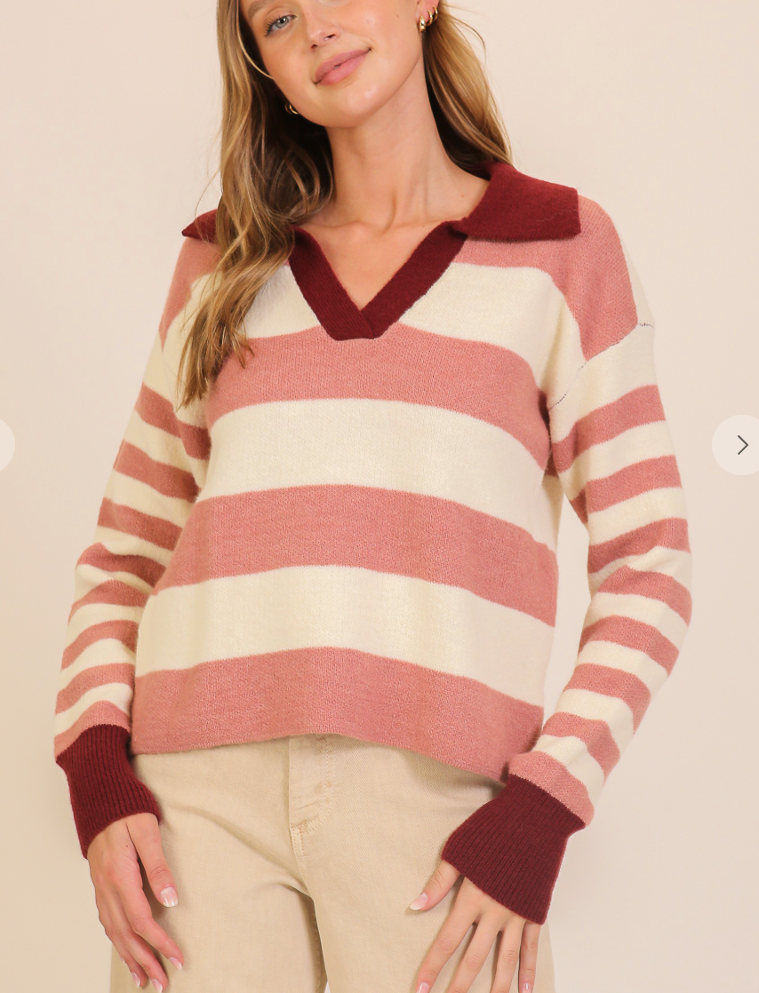 This striped collar polo sweater effortlessly bridges casual and refined style. Horizontal wide stripes create visual interest while the contrast ribbed polo collar and cuffs add a polished touch. The V-neckline with collar delivers that coveted tailored-yet-relaxed aesthetic, while drop shoulder seams enhance the comfortable, laid-back silhouette. Crafted from soft, medium-weight knit fabric, it drapes beautifully without clinging. The hip-length hem provides ideal coverage and movement for everyday wear. Perfect for layering or wearing solo, this versatile piece transitions seamlessly from weekend outings to casual office settings.