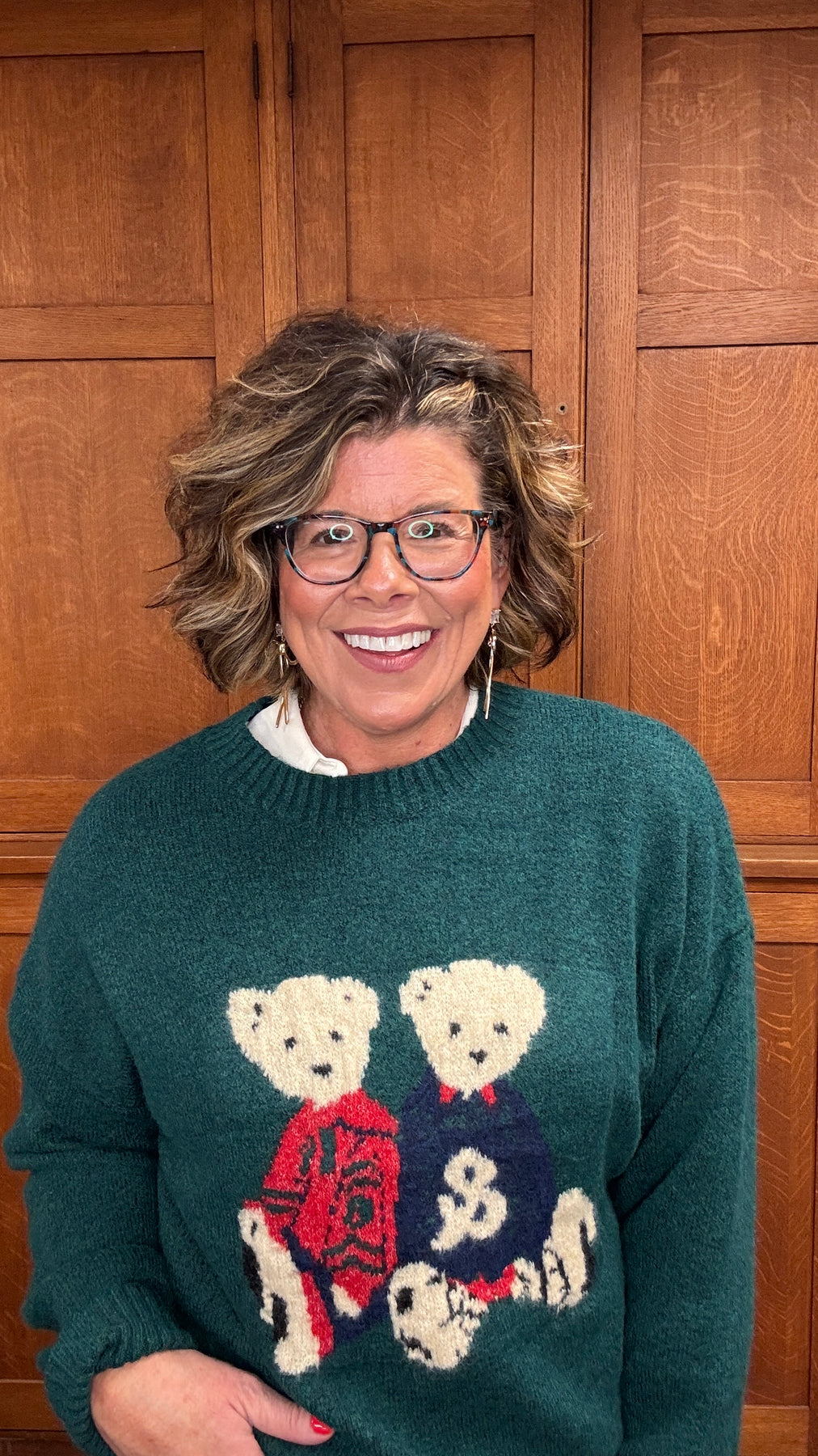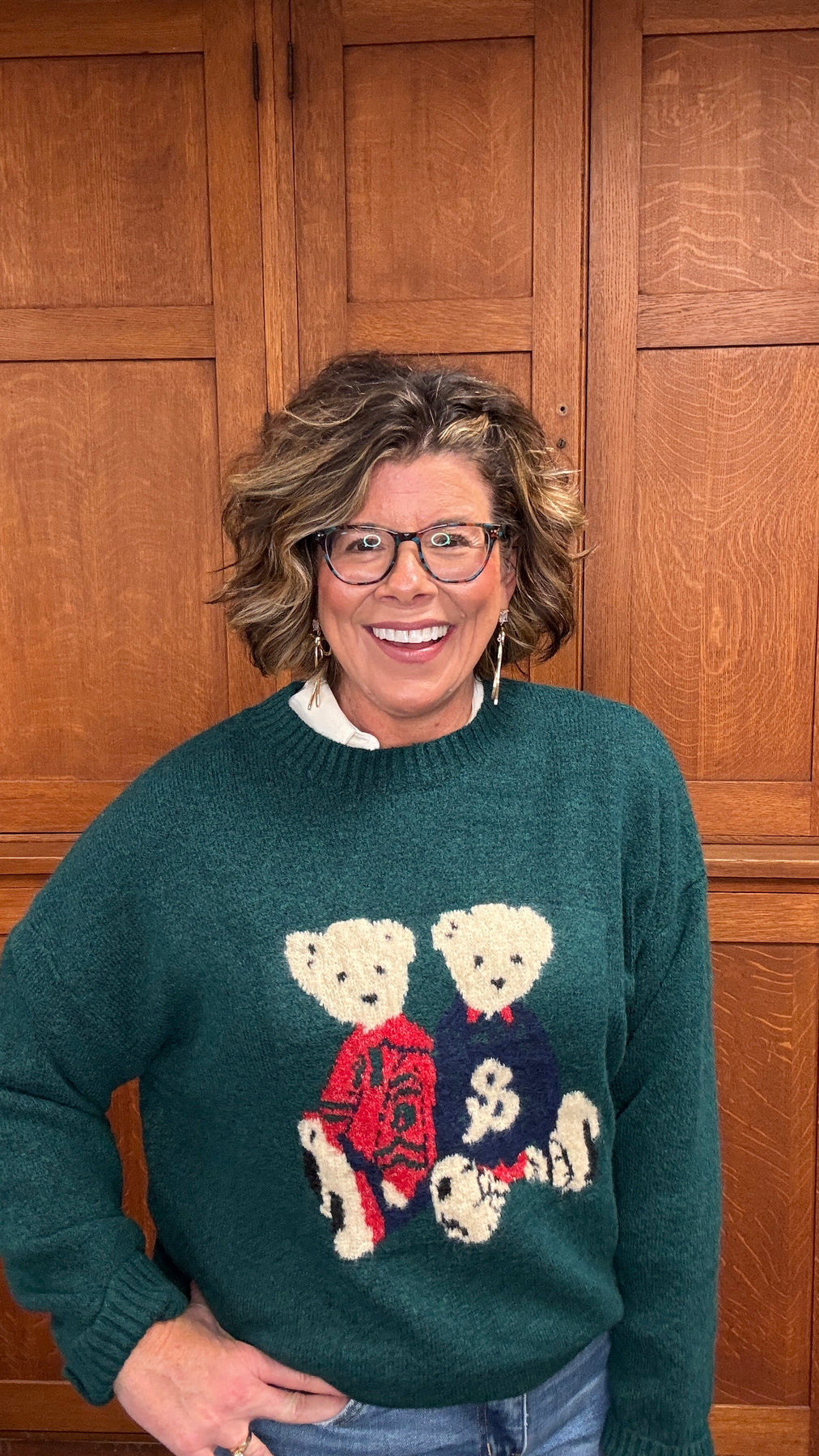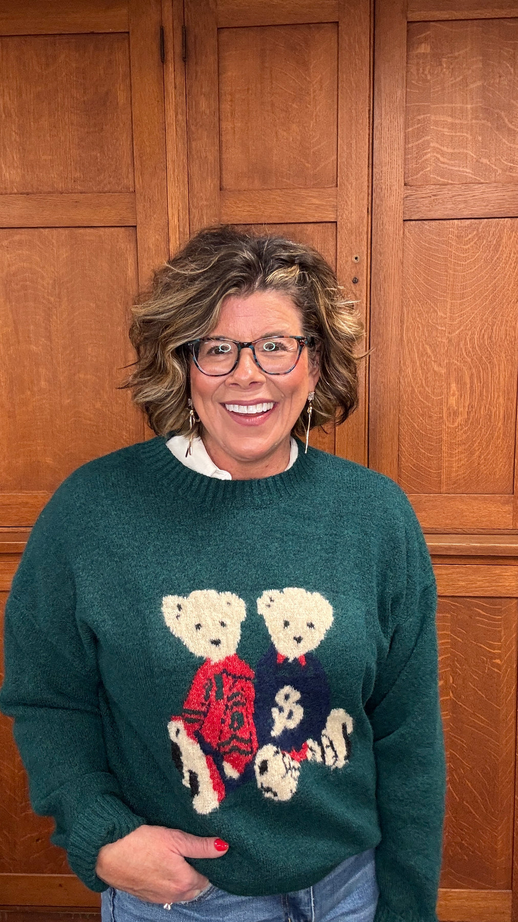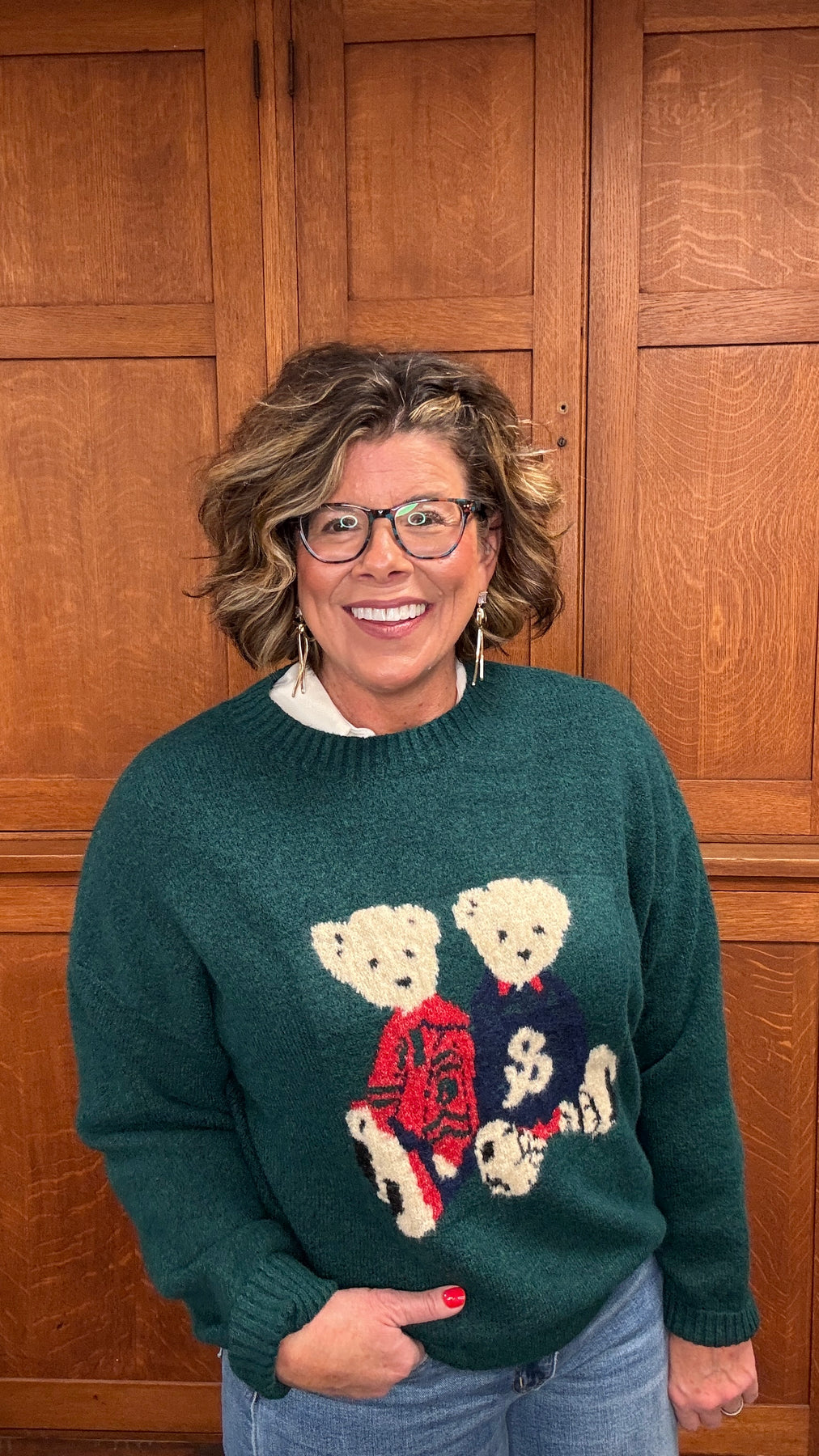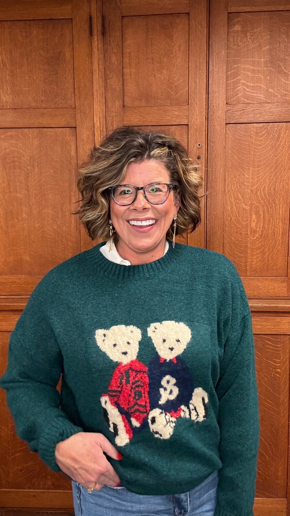 Wrap yourself in cozy comfort with this charming teddy bear pullover sweater. Featuring an adorable knit teddy bear design across the chest, this piece combines playful style with everyday wearability. The relaxed, slightly oversized silhouette drapes beautifully with drop shoulder sleeves and ribbed cuffs for a modern, effortless look. A ribbed round neckline and hem provide structure while the soft fabric keeps you warm and hugged all day long. Perfect for layering or wearing solo, this sweater is your new go-to for casual elegance.