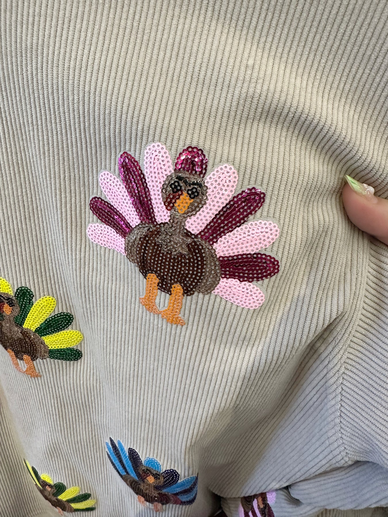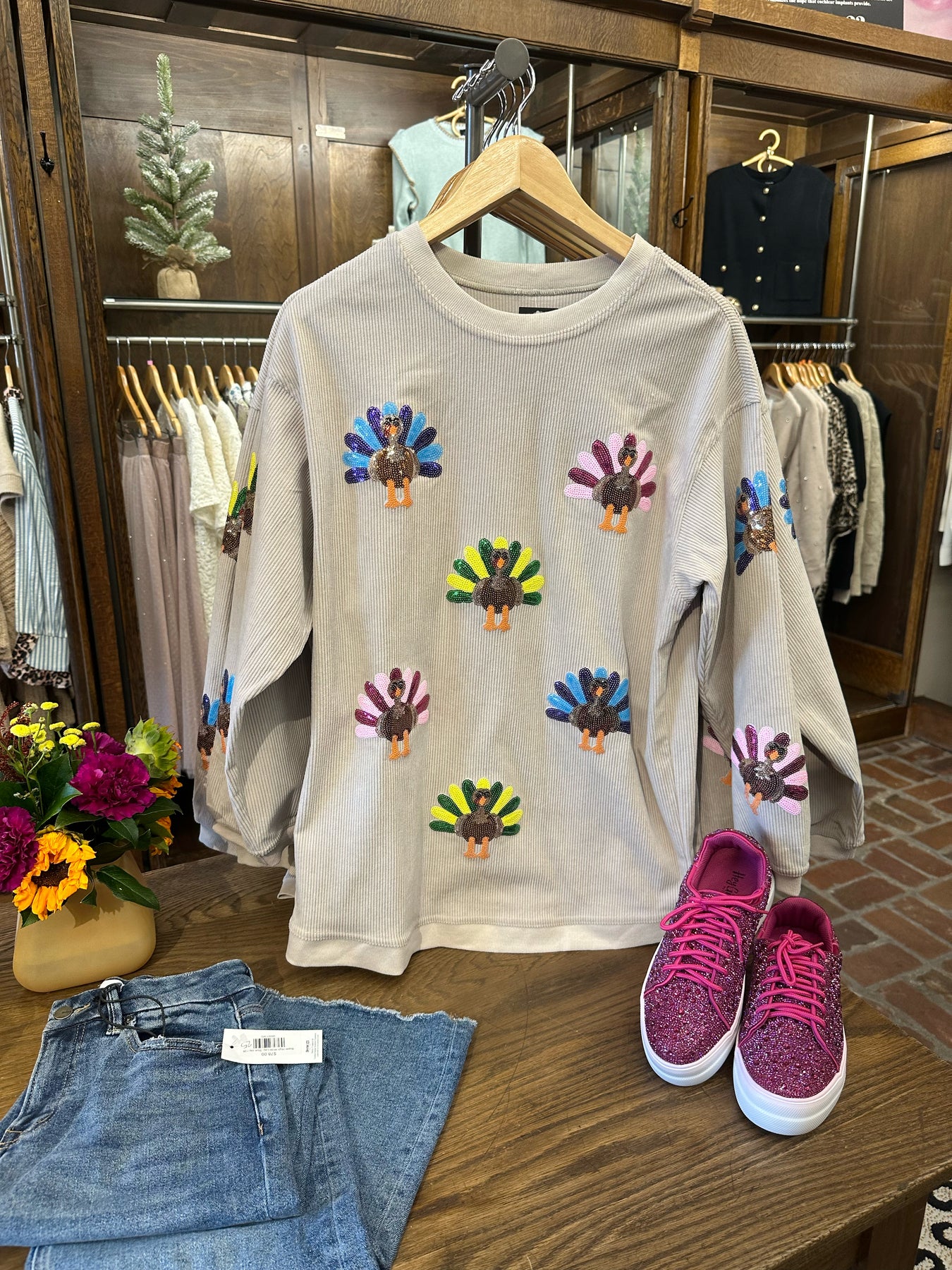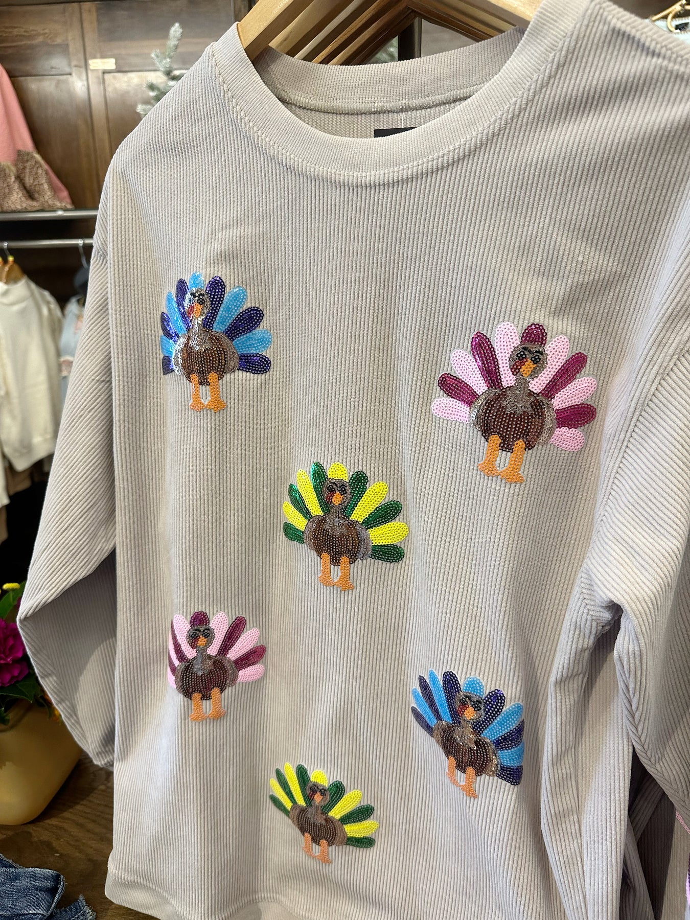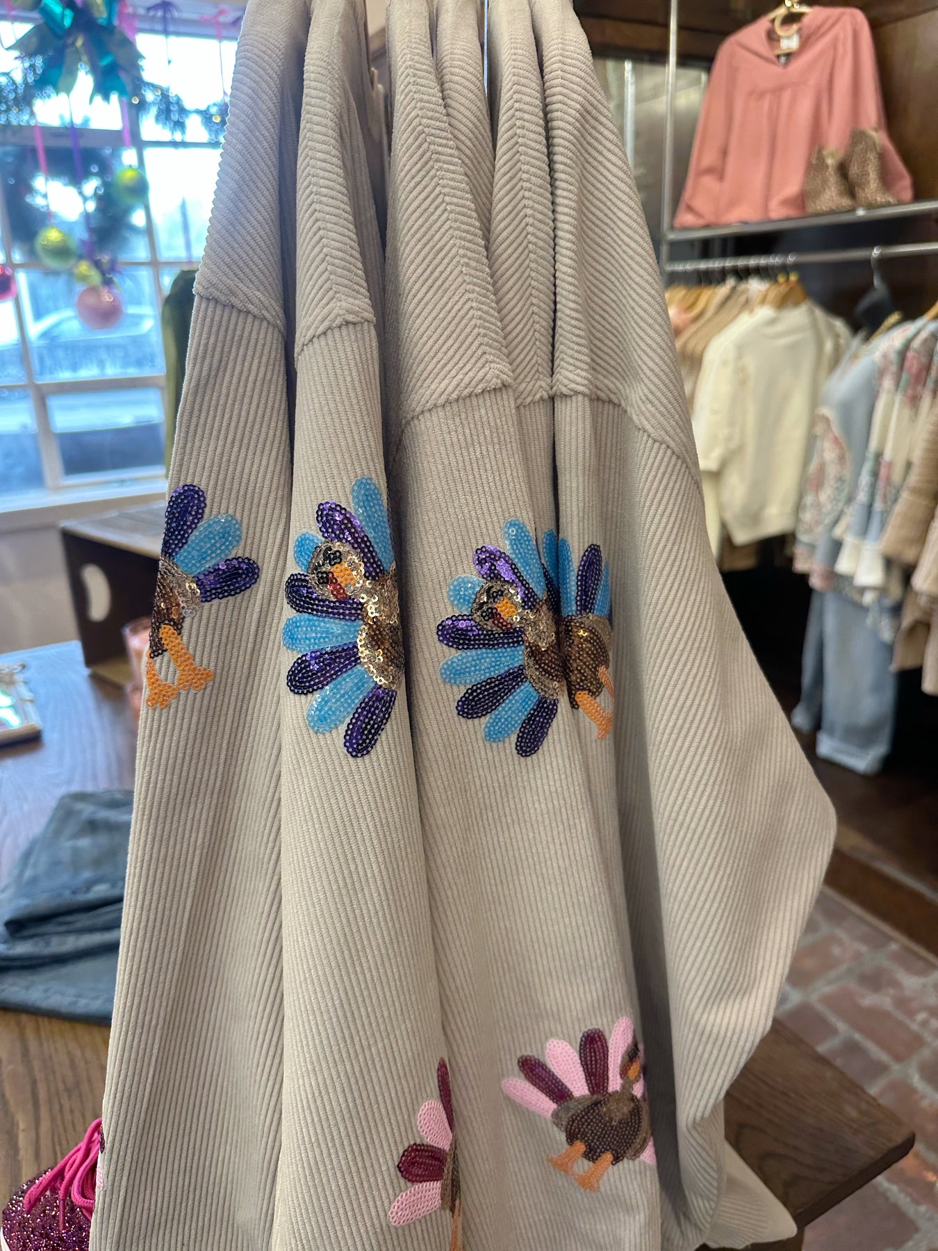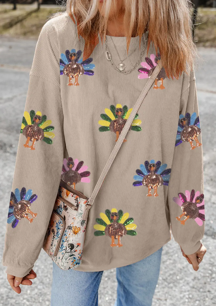 Celebrate the season in this eye-catching Turkey Sequin Sweater, featuring a shimmering glitter graphic that commands attention. The relaxed, baggy silhouette with dropped shoulders and tunic length delivers effortless comfort perfect for everyday fall and winter wear. Crafted for women of all ages, this casual graphic sweatshirt combines playful style with cozy wearability—ideal for making a bold statement while staying warm and comfortable through the cooler months.