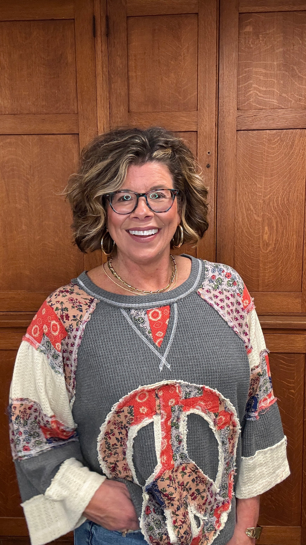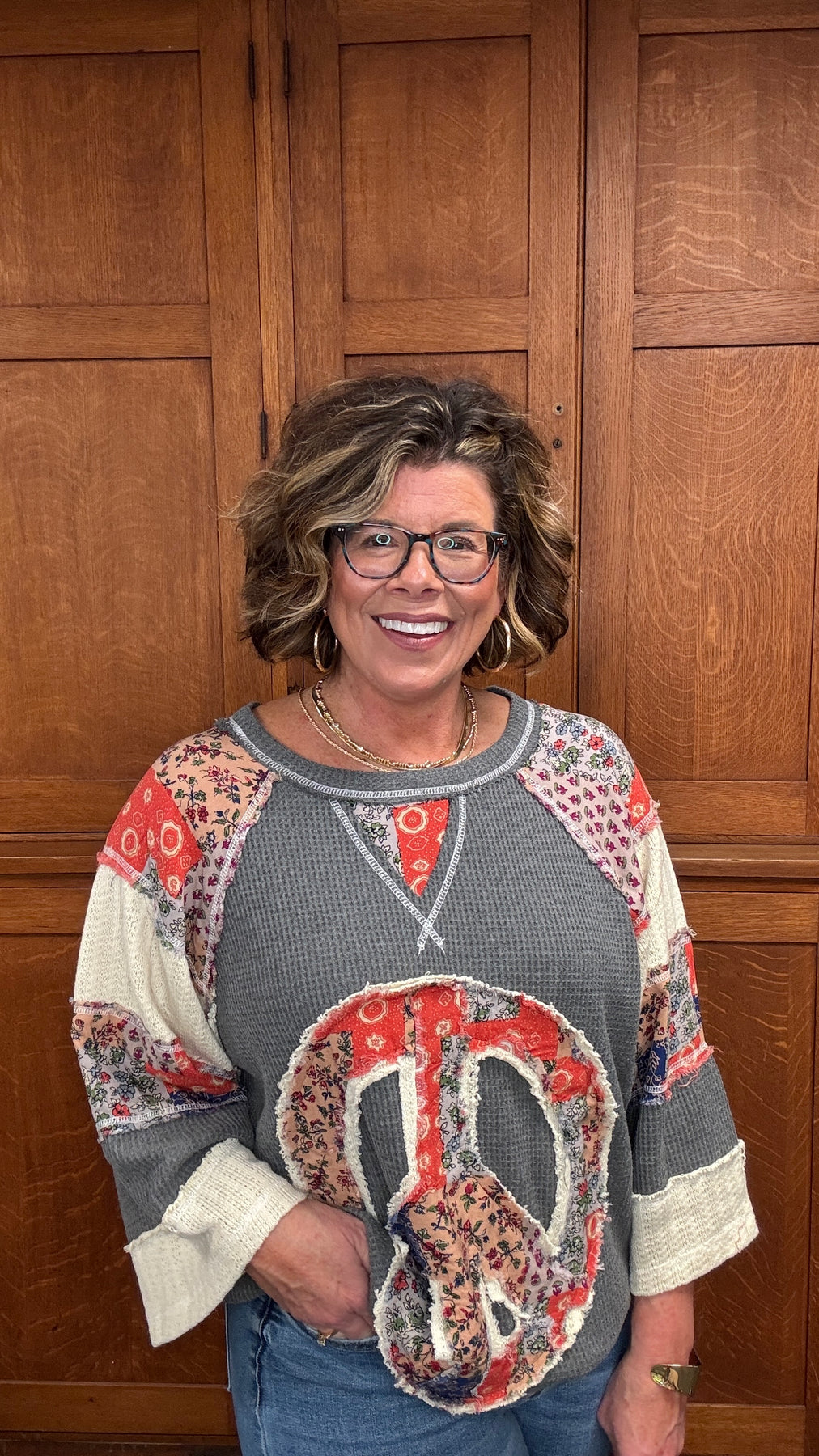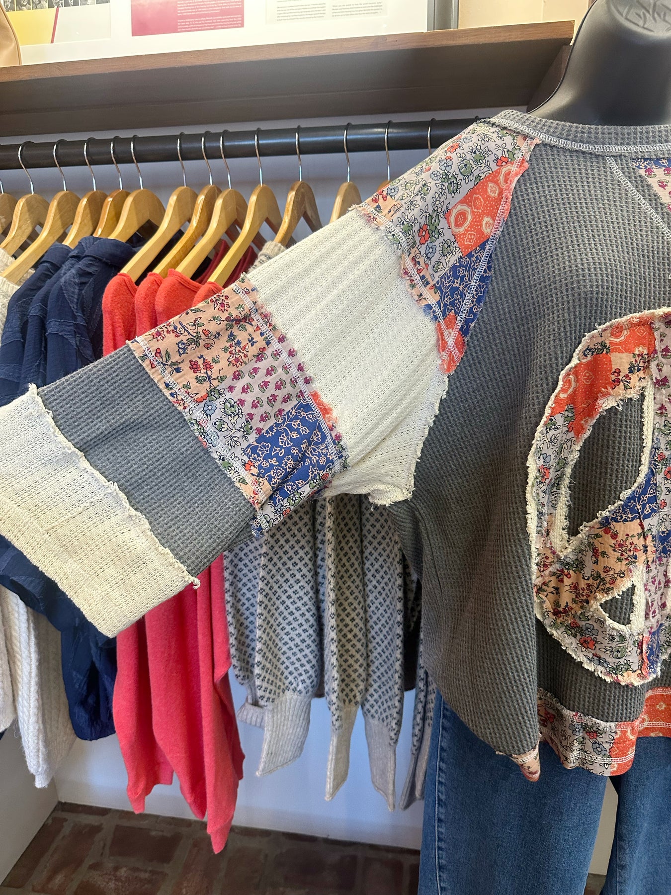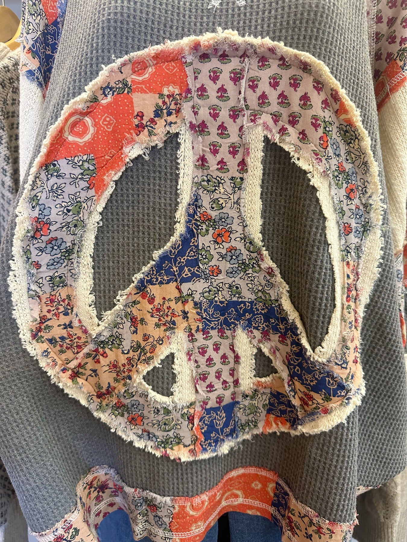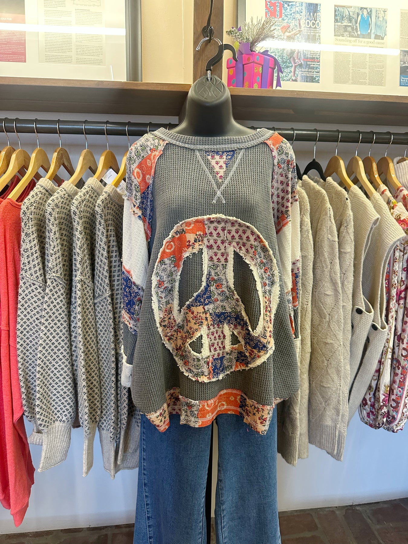 Discover comfort meets style in this Charcoal thermal knit top. Featuring a relaxed round neck, three-quarter sleeves, and a meaningful peace patch detail, it's designed for everyday versatility. Side slits and vintage washing give it an effortlessly cool edge, while the roomy fit ensures all-day ease. Perfect for layering or wearing solo.