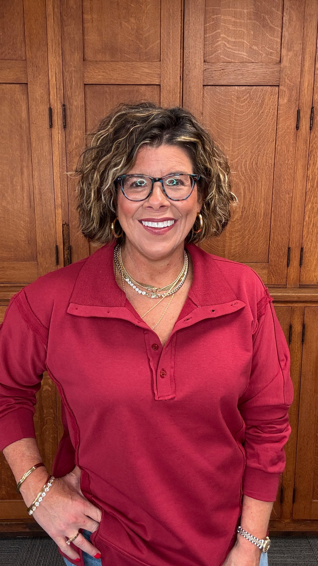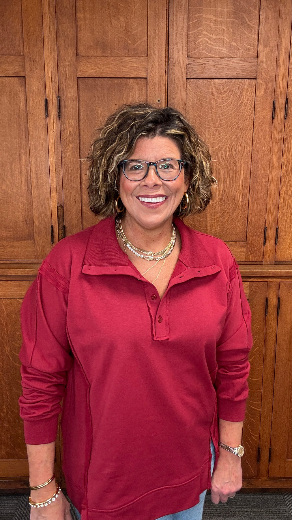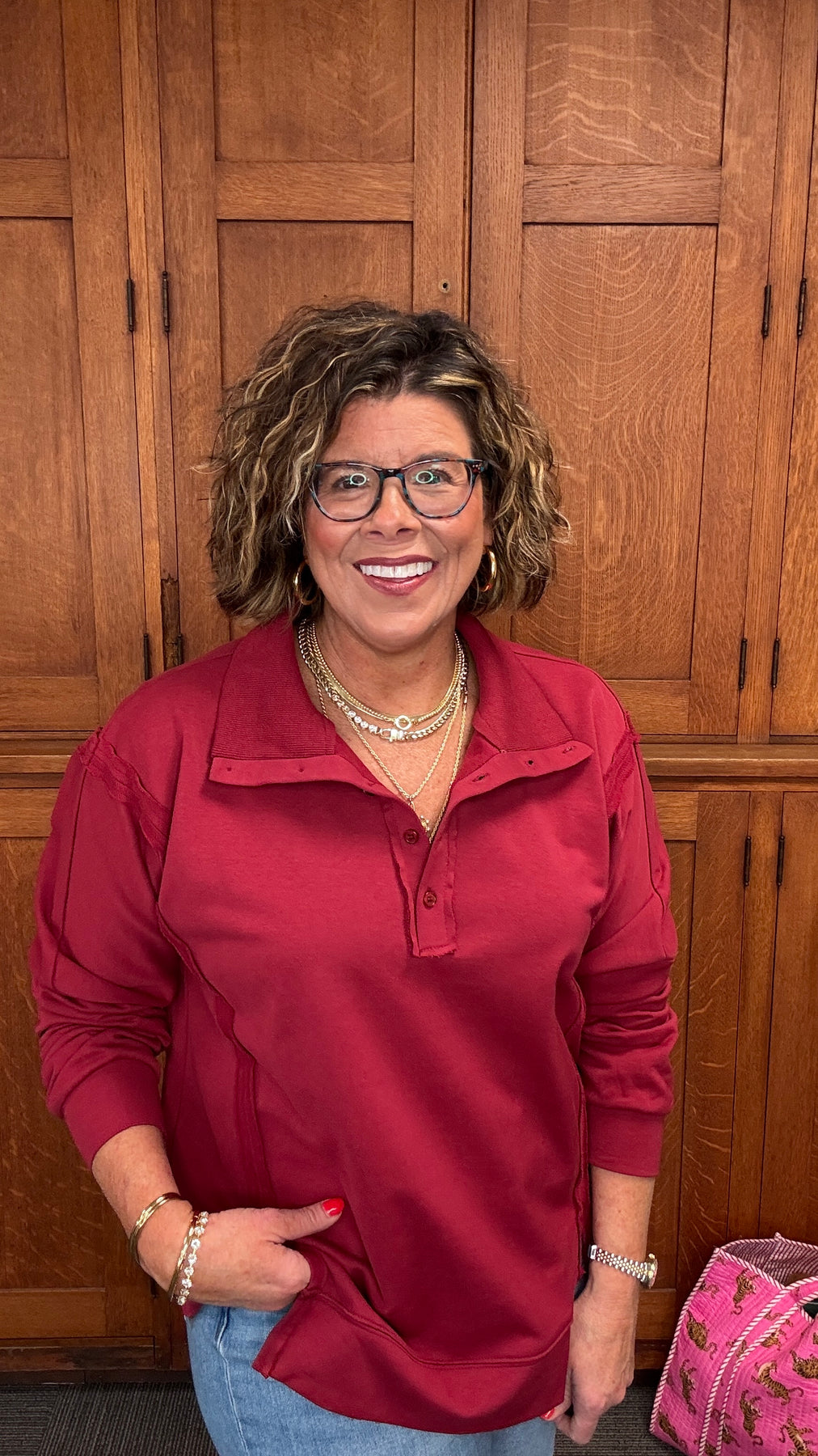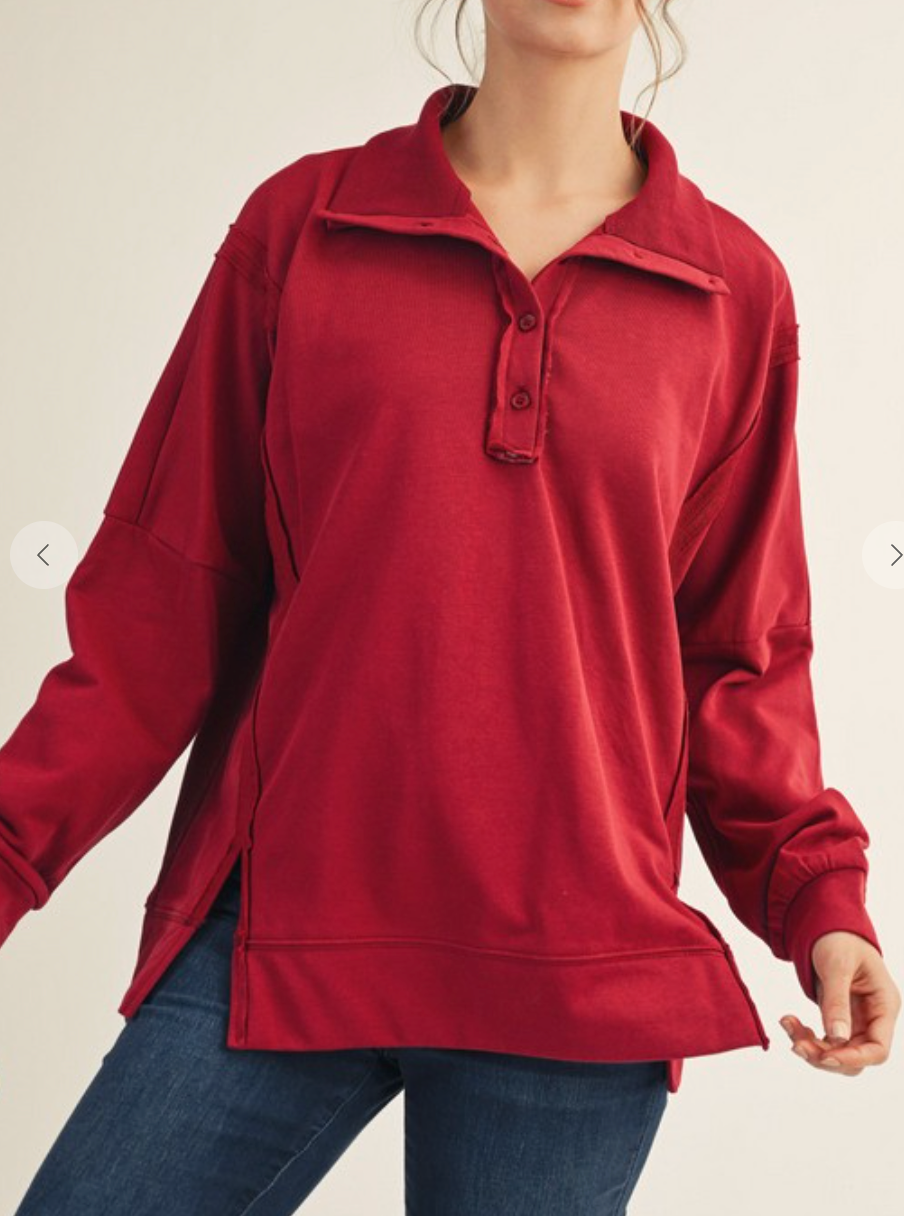 Elevate your everyday wardrobe with this striking burgundy top that combines modern edge with timeless sophistication. The relaxed drop shoulder silhouette creates an effortlessly chic vibe, while the raw cut accents add an intentional, fashion-forward touch. Button up the high neckline for a polished look, or leave it partially undone for laid-back appeal. The subtle slit detail enhances movement and dimension, making this versatile piece perfect for dressing up or down. Whether you're heading to the office or out for the weekend, this top delivers style that turns heads.