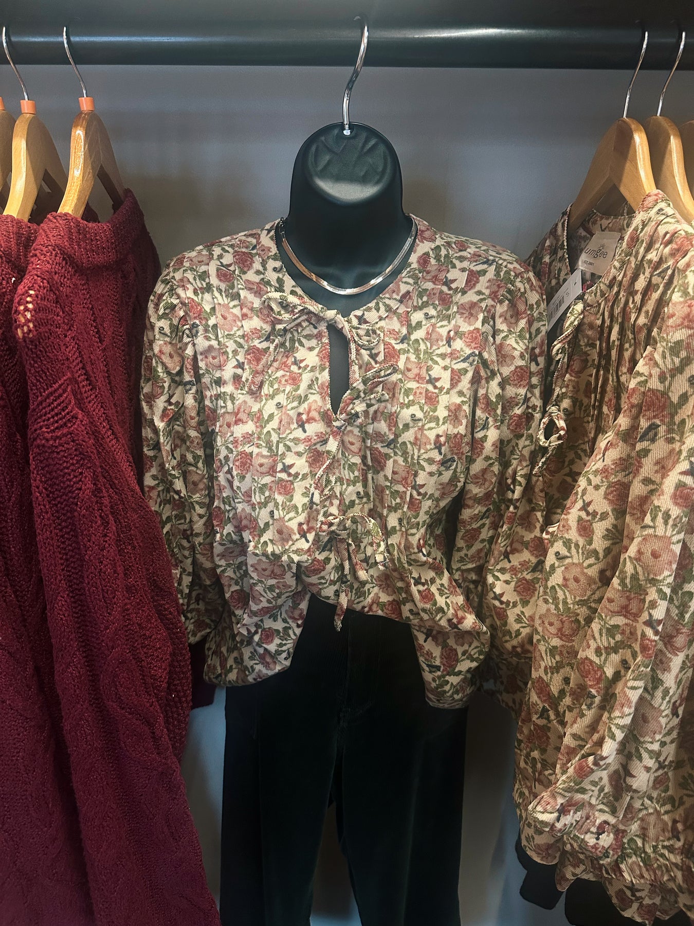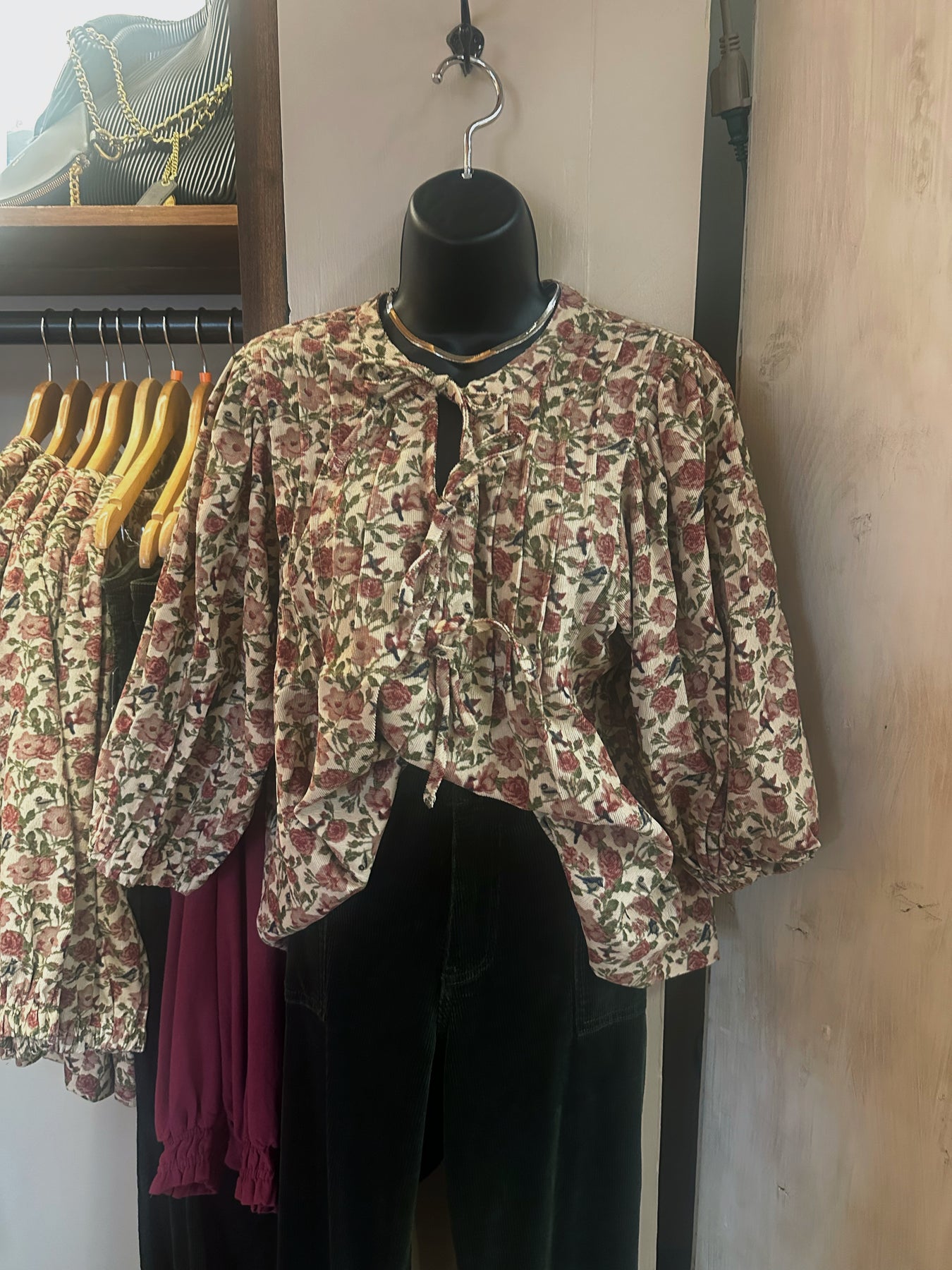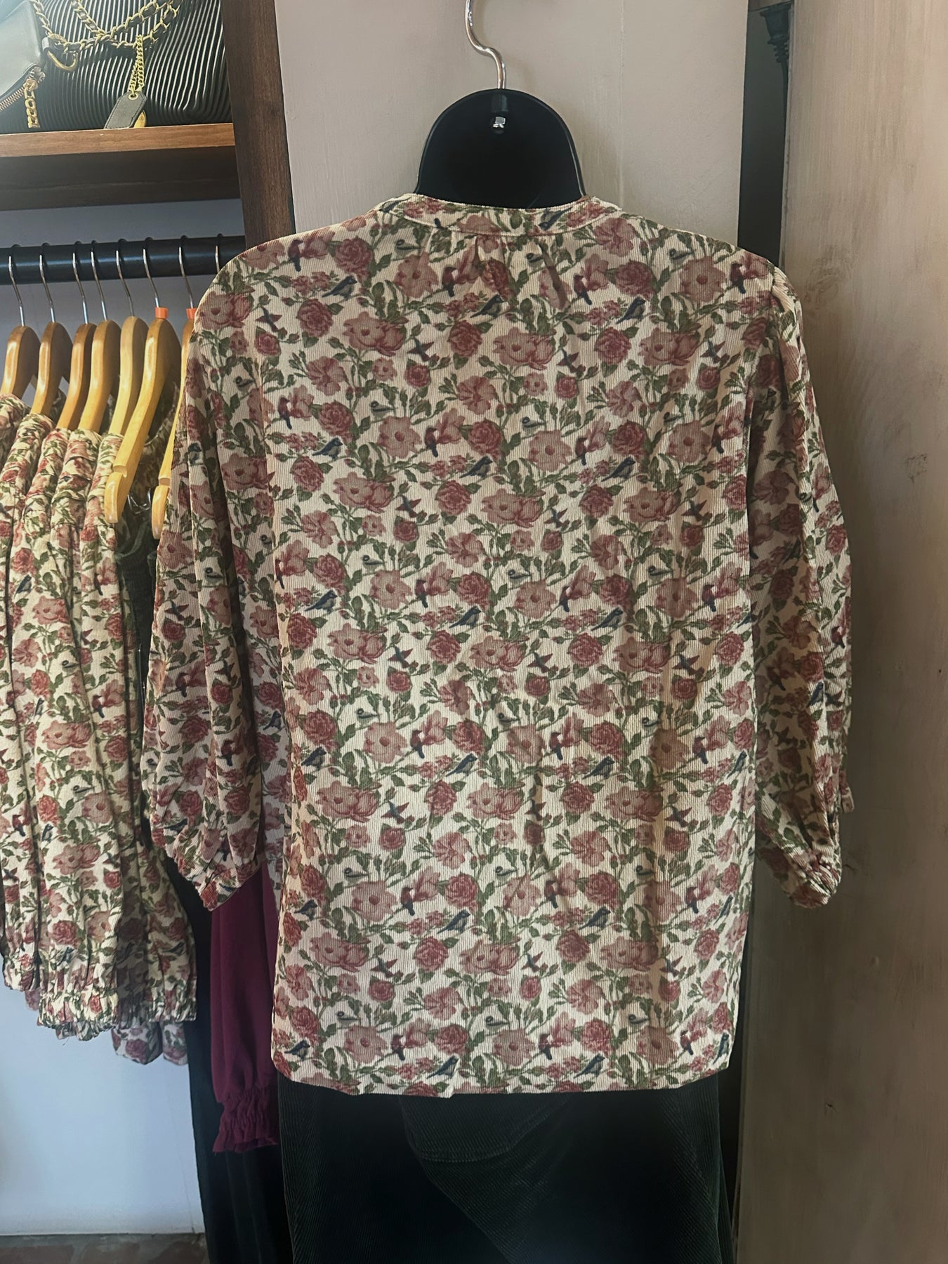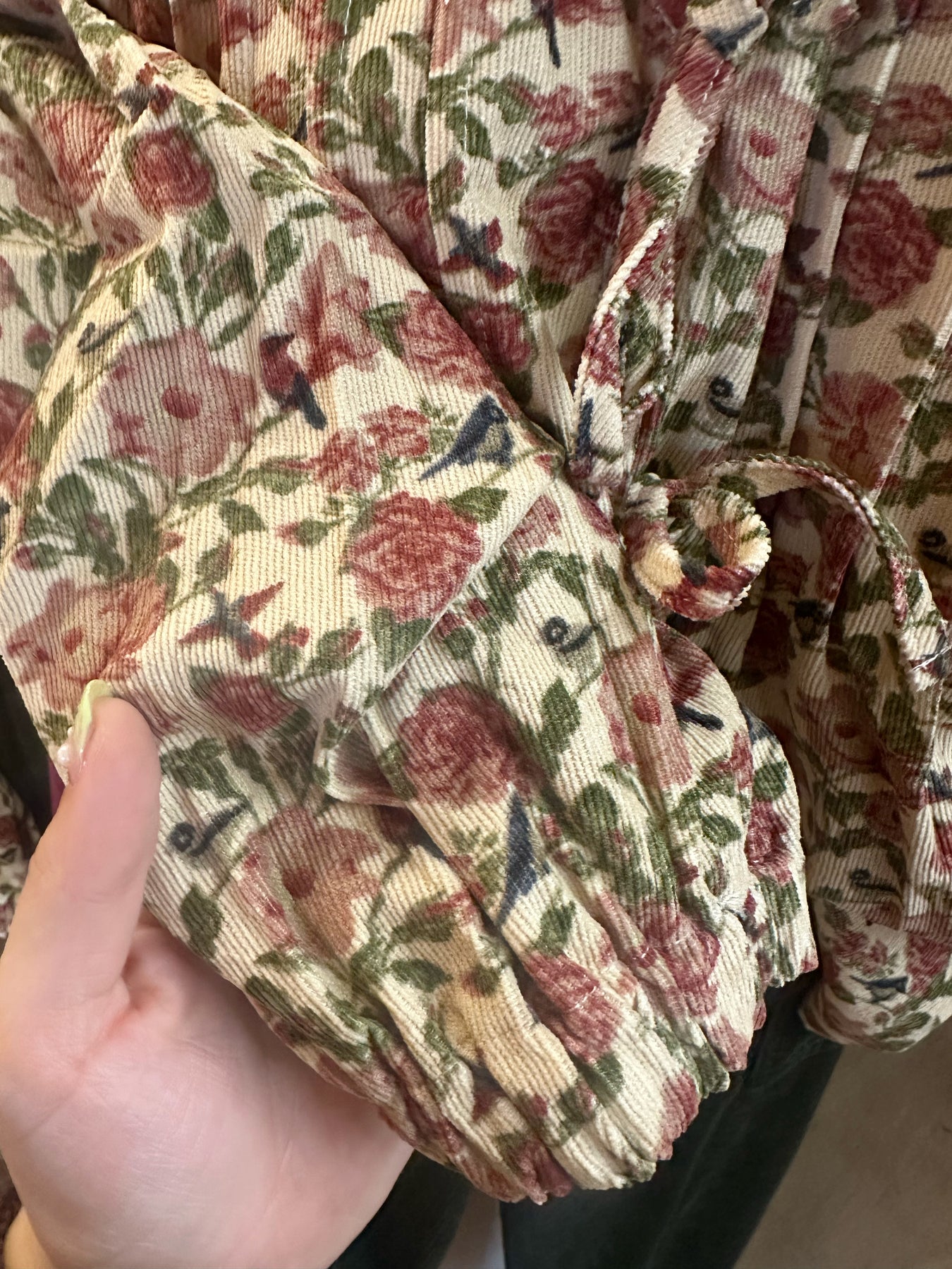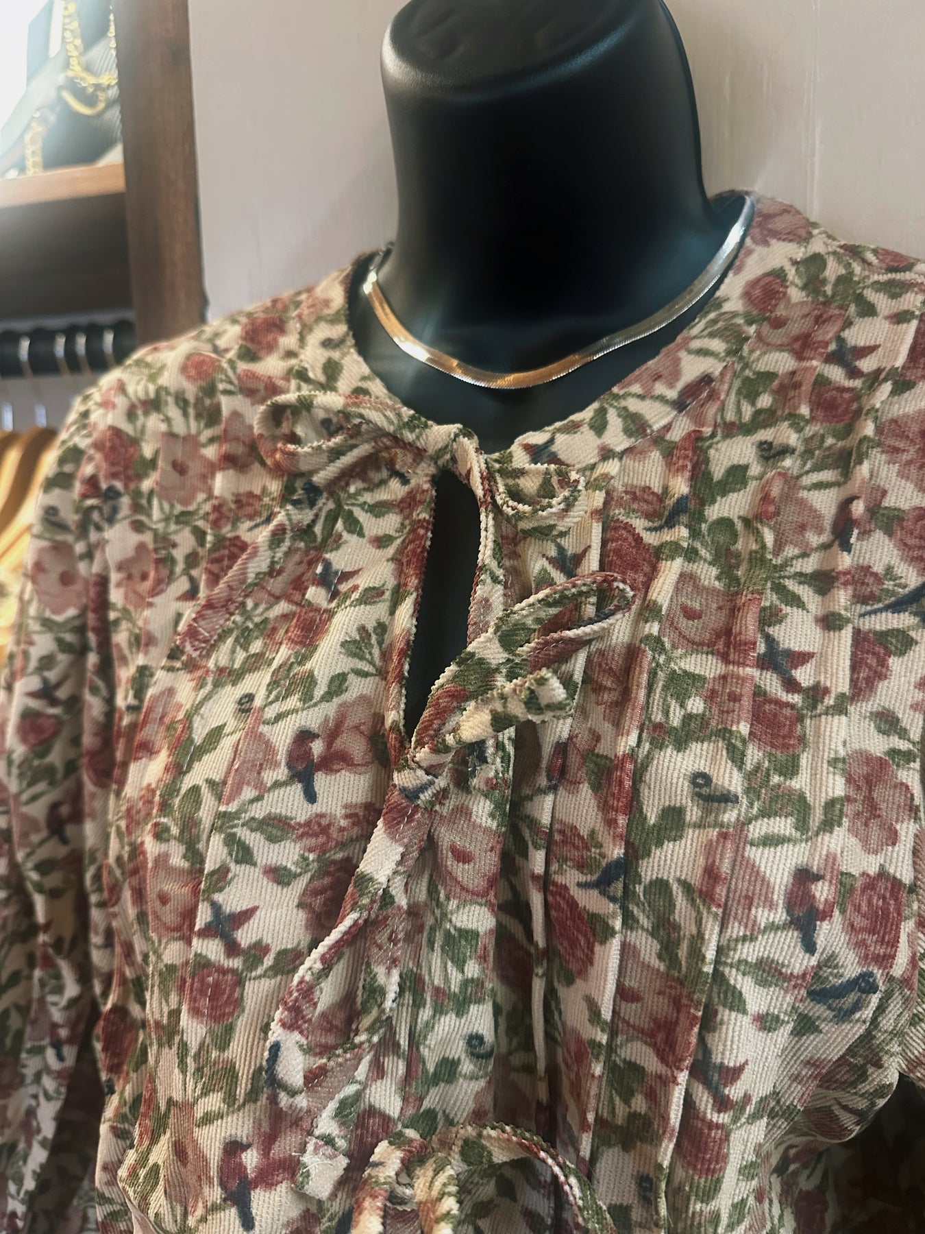 Embrace timeless charm with this Cream Floral Bow Blouse, featuring delicate pintuck details that enhance its vintage-inspired design. Crafted from cozy corduroy and accented with elegant ribbon, it combines softness with subtle texture. The round neckline is complemented by a graceful tie, adding a feminine touch that's perfect for elevating your everyday look or dressing up for special moments.