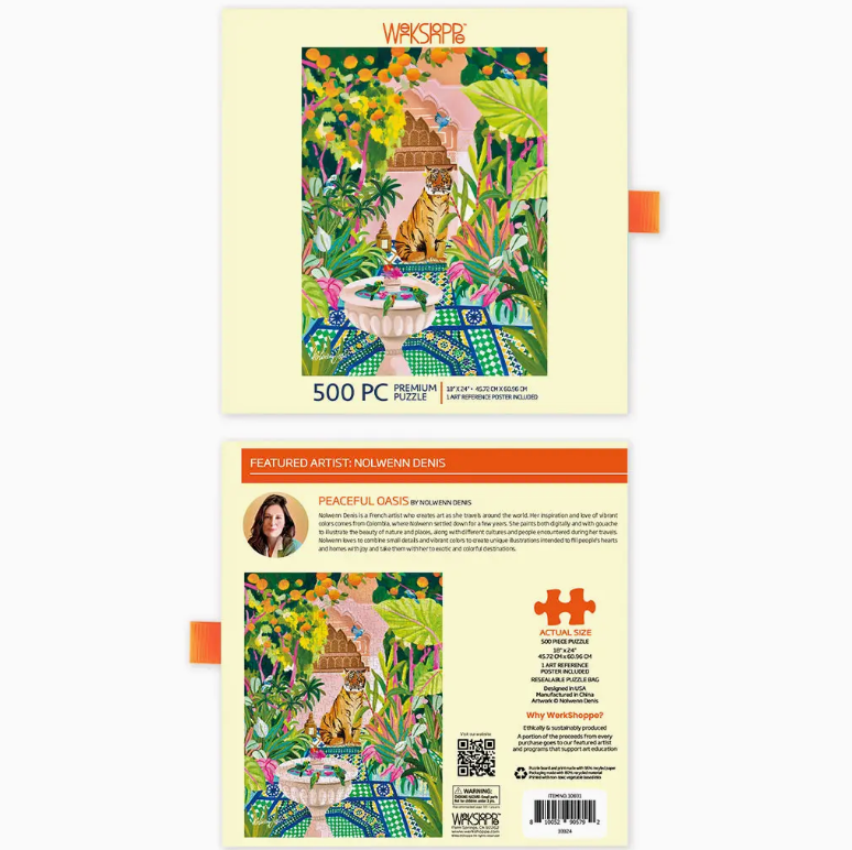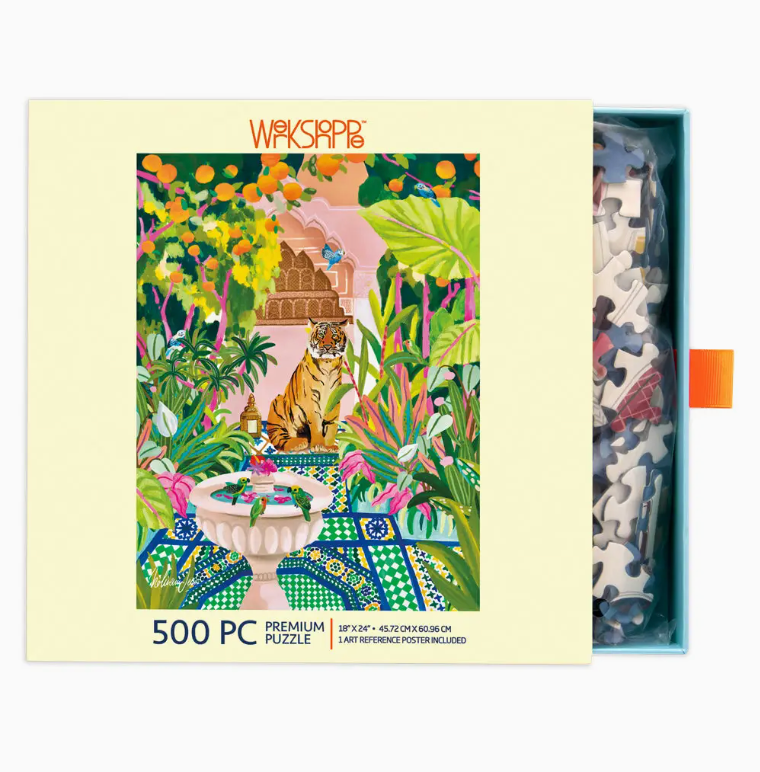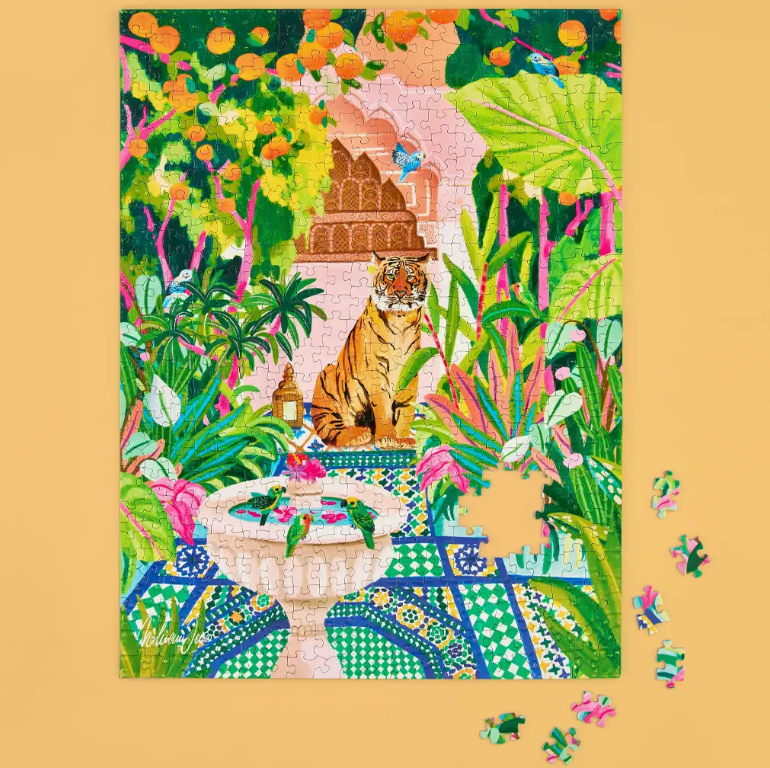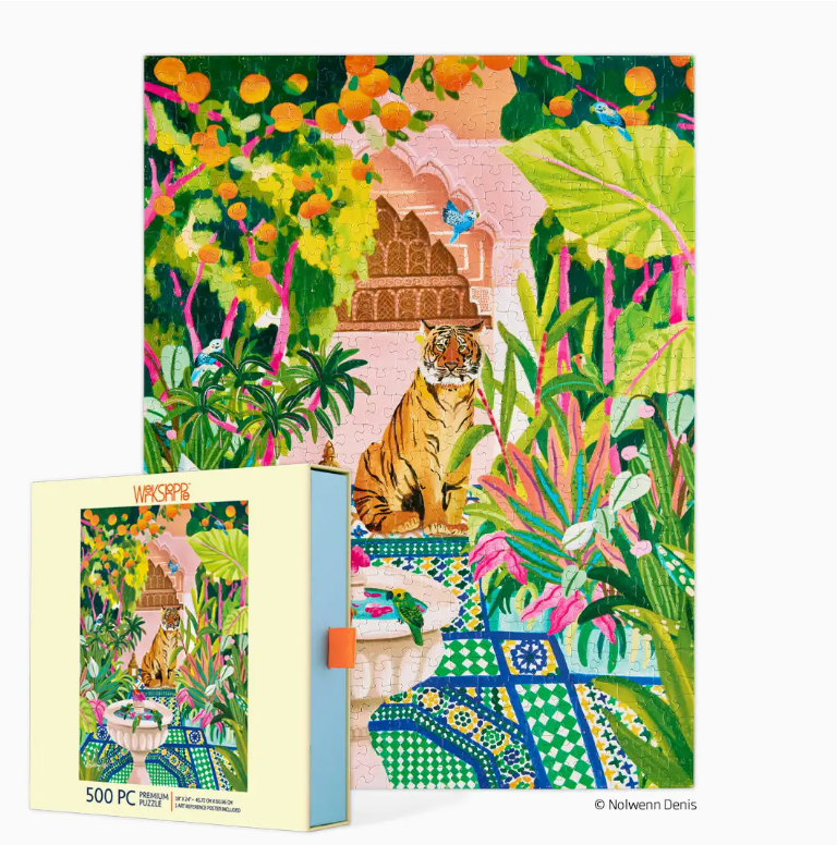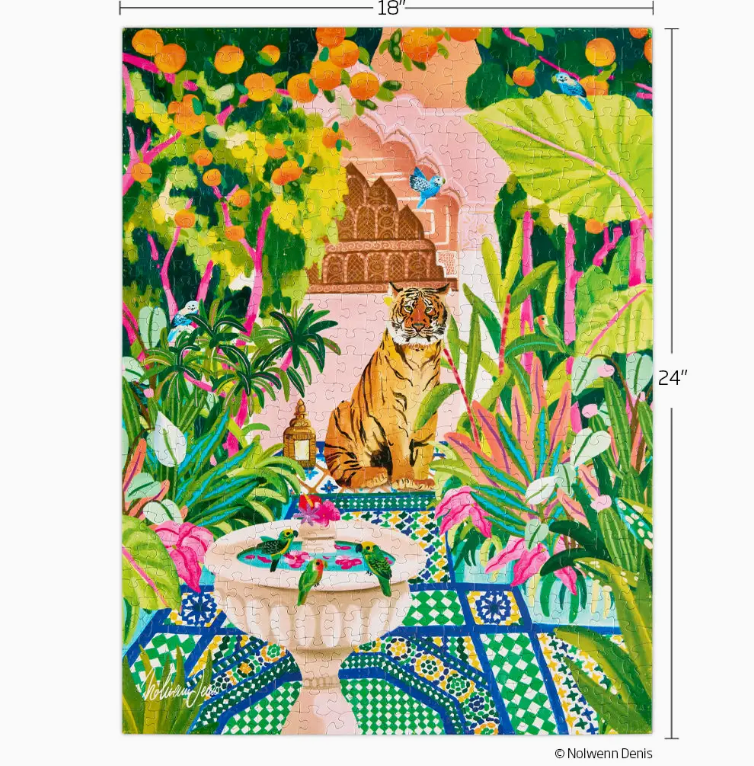 This 500-piece puzzle will transport you to a lush Moroccan garden setting complete with relaxing tiger and winged friends; exotic in its subject matter and bountiful colors.