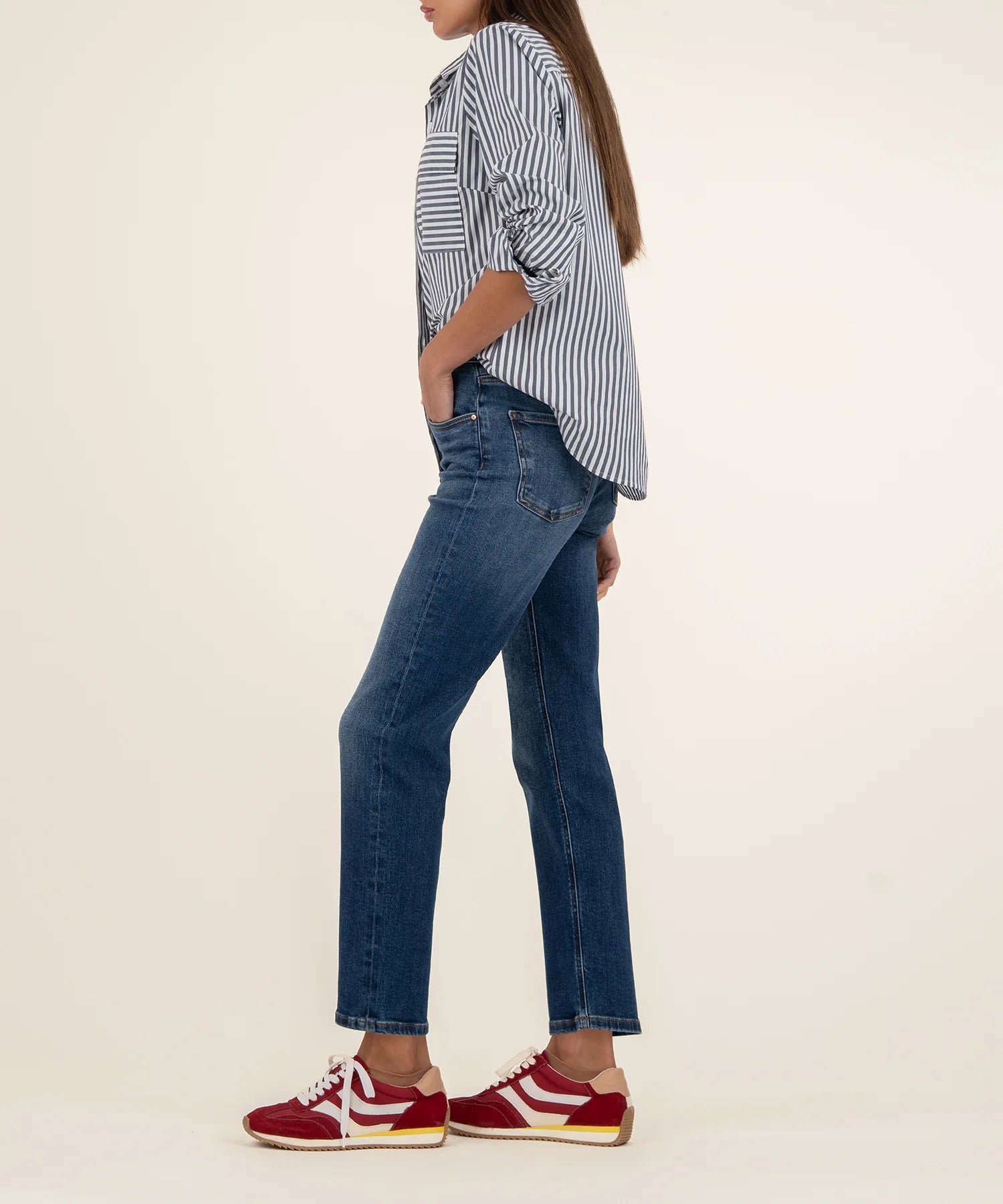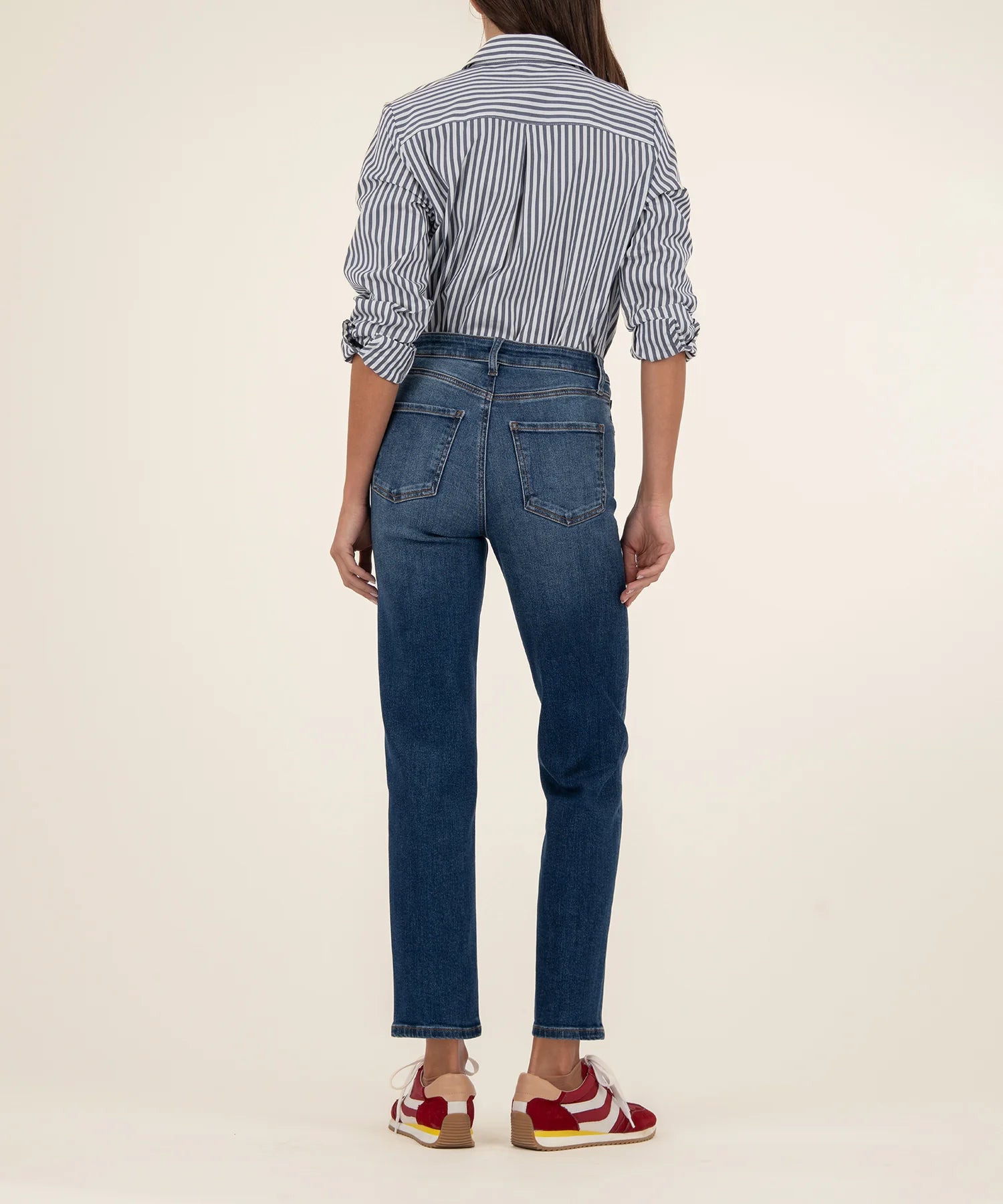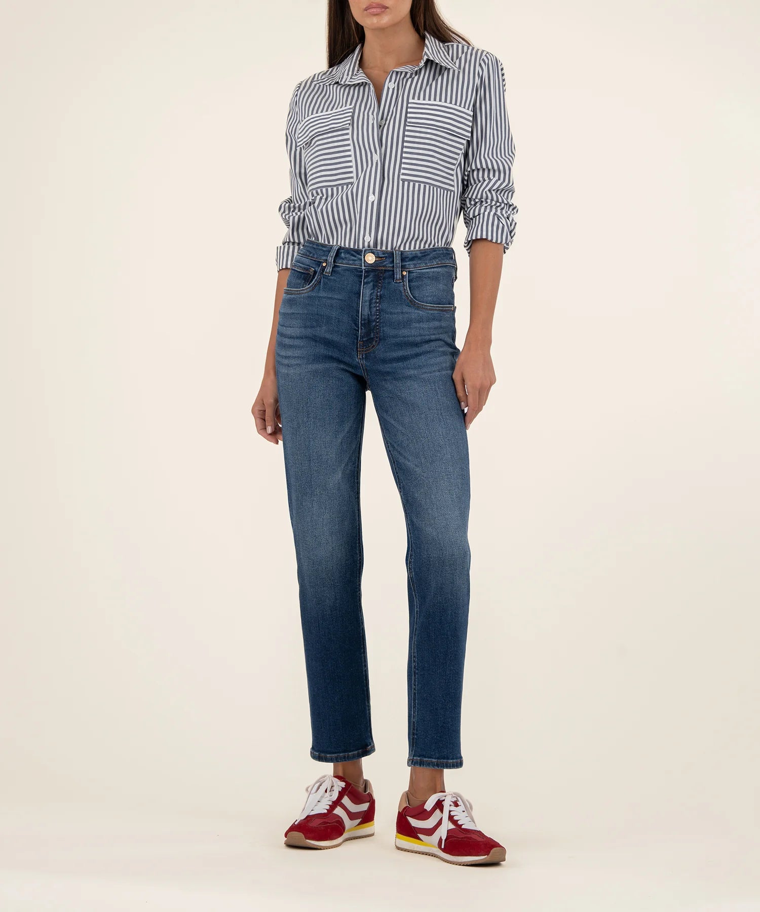 Experience comfort and style with these high-rise straight leg jeans in a classic dark wash. Made from stretchy material with Fab Ab for a flattering fit, they provide all-day support and shape. A timeless silhouette perfect for any wardrobe.