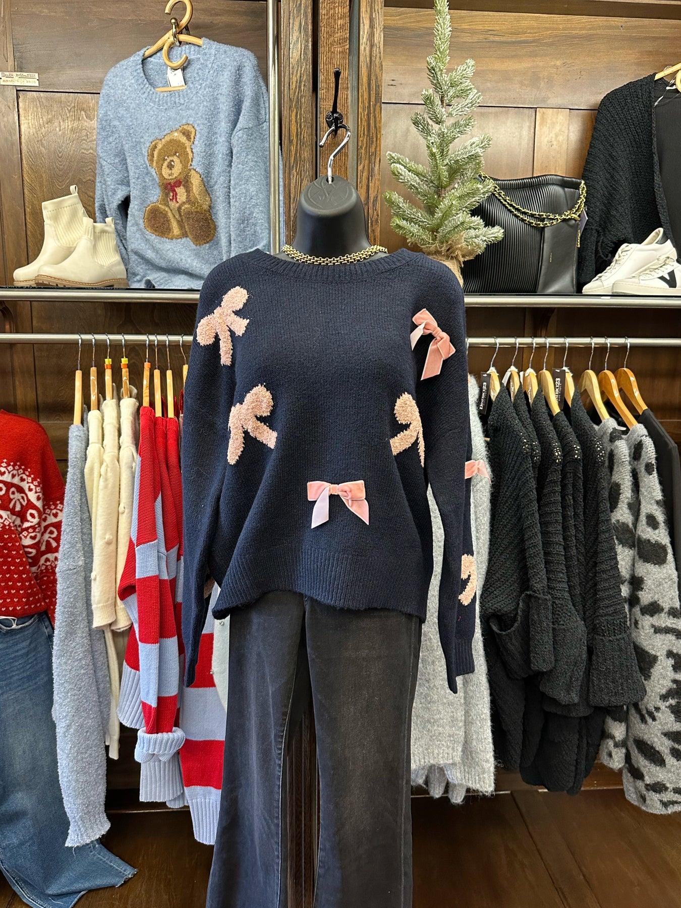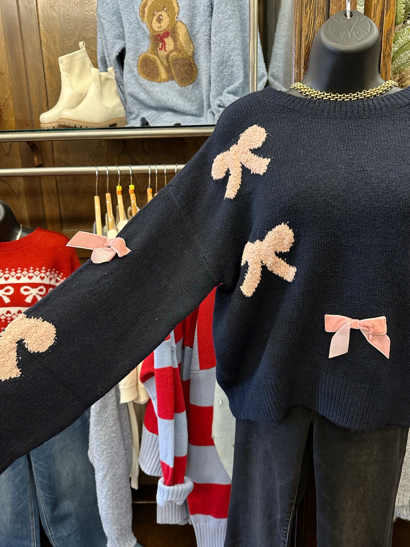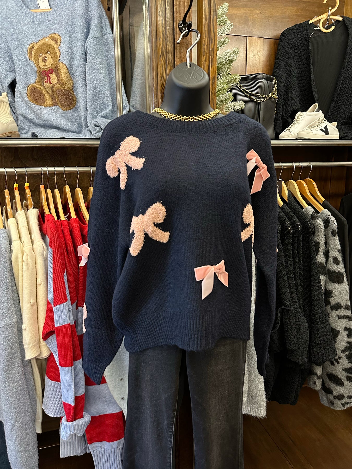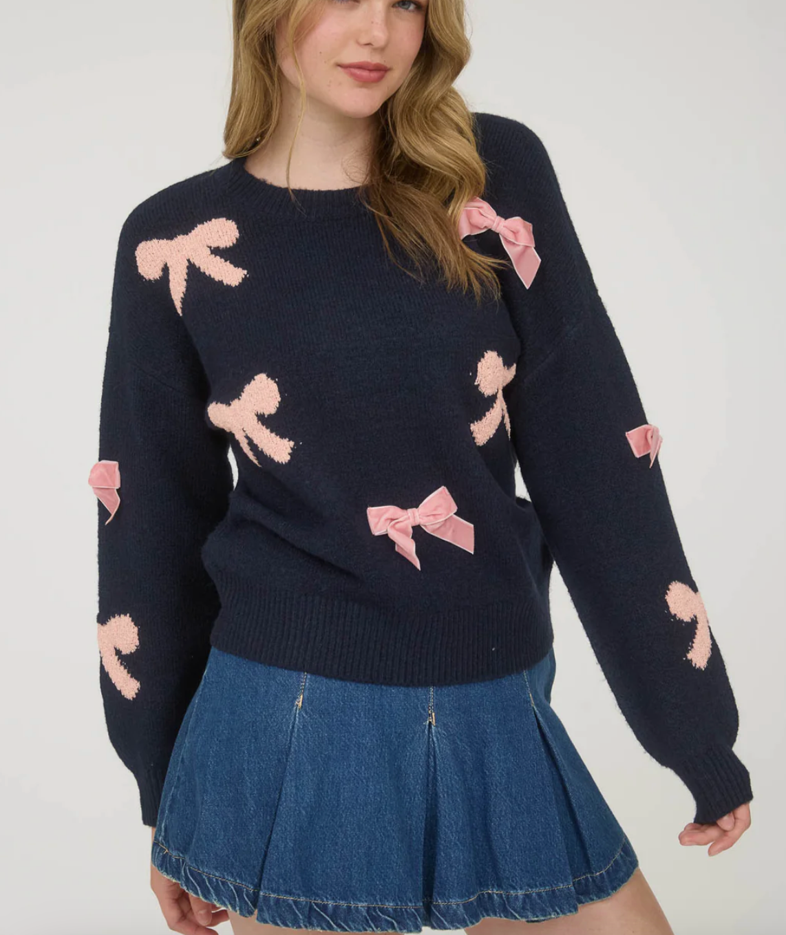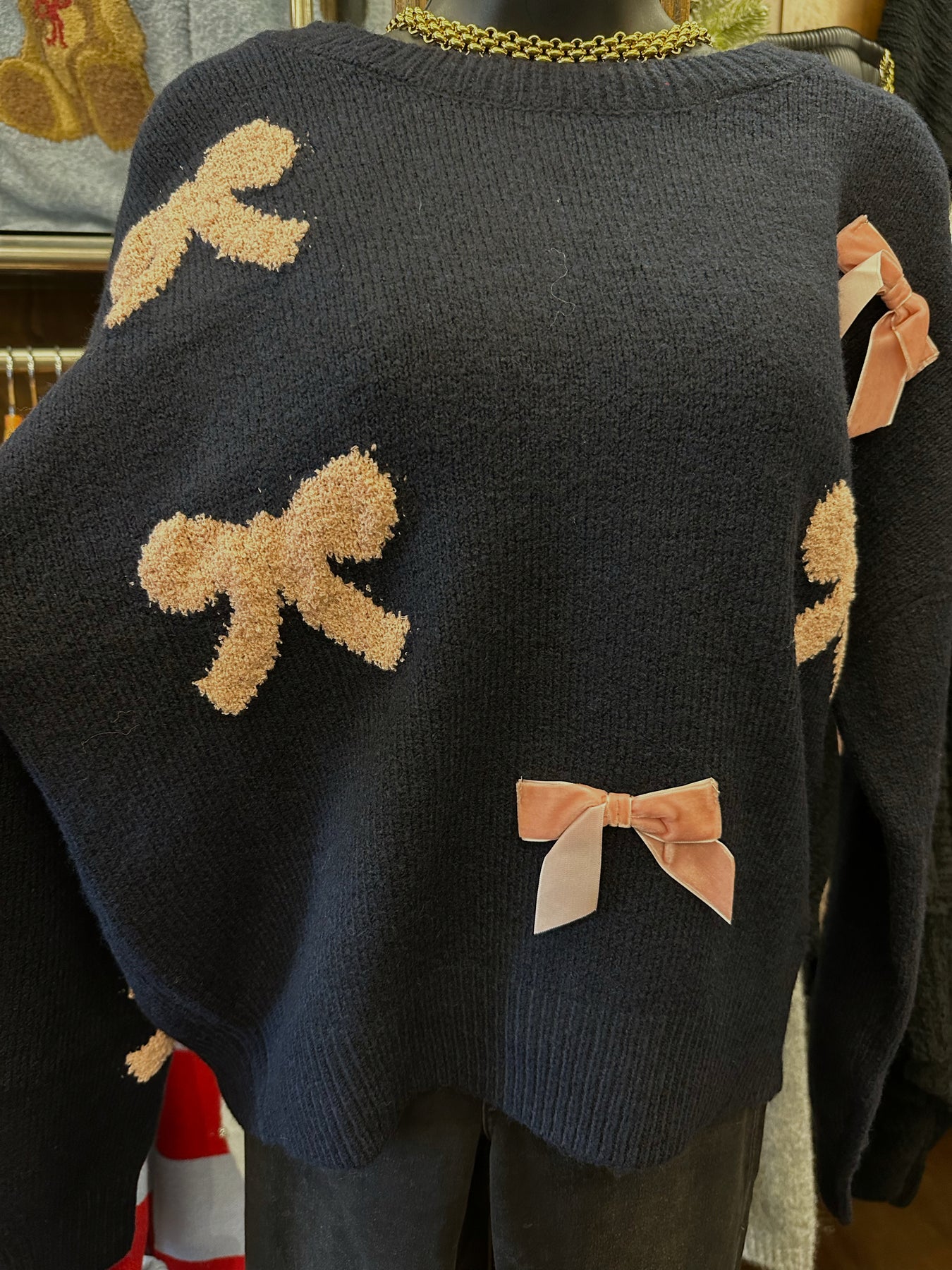 Elevate your everyday style with this charming Pink Bow Navy Sweater, a versatile piece that effortlessly blends comfort and sophistication. Featuring a classic crew neckline and relaxed fit, this knit pullover drapes beautifully with drop shoulders for a modern silhouette. The delicate bow pattern and bow detail add a touch of feminine elegance, while long sleeves provide warmth without bulk. Unlined for breathable comfort, this sweater transitions seamlessly from casual outings to cozy nights in. A timeless essential that deserves a permanent spot in your wardrobe.