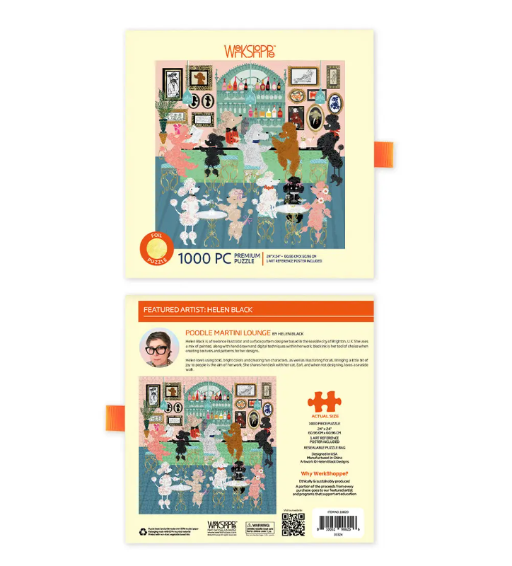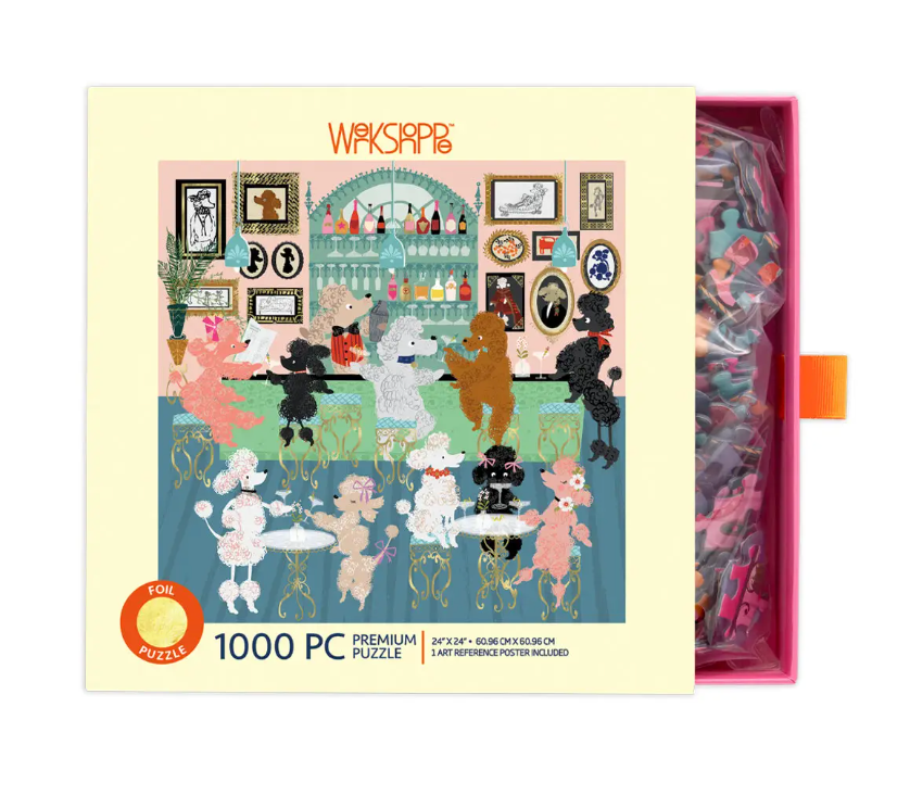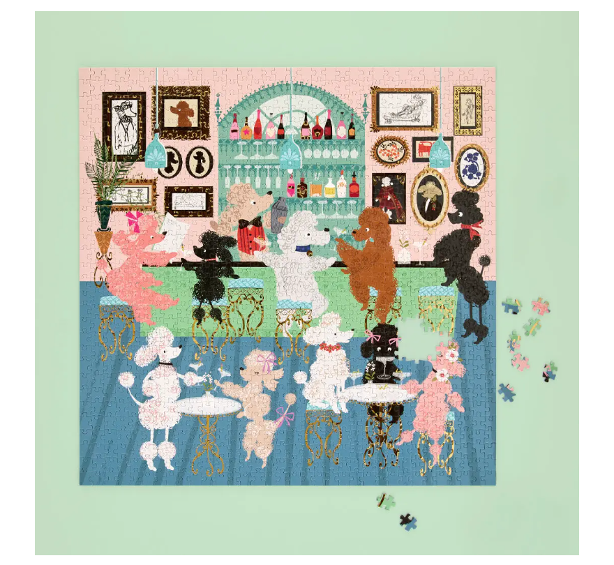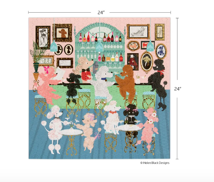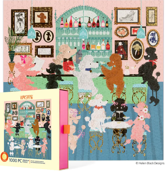 This 1000-piece square-shaped puzzle depicts fashionable poodles drinking martinis and socializing in this cheeky club with the Doogie decor and 'tini vibe.