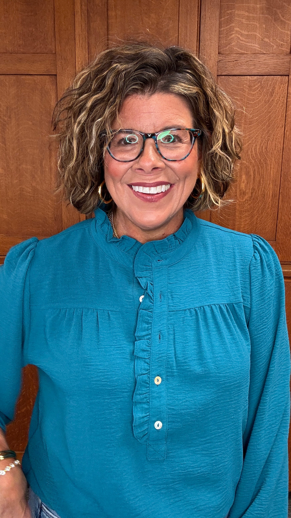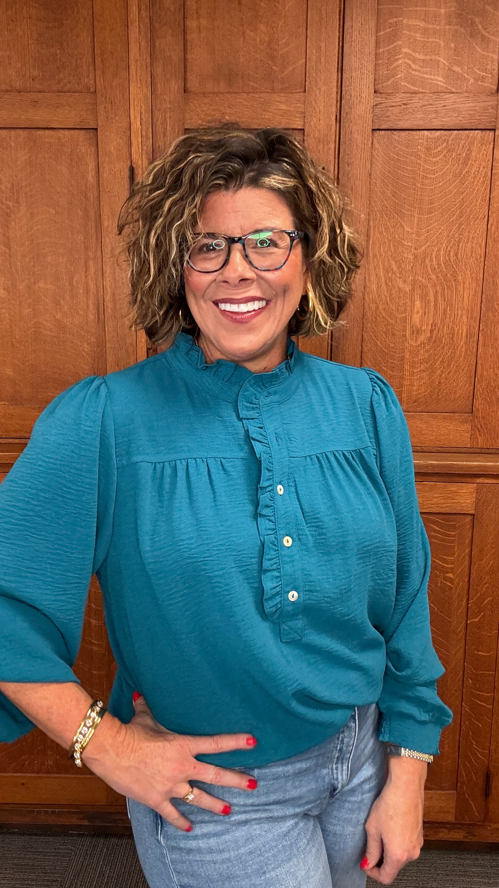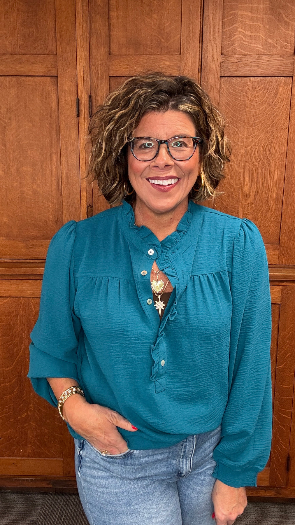 Elevate your holiday wardrobe with this sophisticated Ruffle Accent Blouse in classic Teal. Featuring long sleeves and a button-up front, this piece combines timeless elegance with modern flair. The standout ruffled mock neckline adds dimension and visual interest, while the textured solid fabric provides depth and texture that photographs beautifully. Perfect for festive gatherings, office parties, or elevated casual occasions, this blouse transitions seamlessly from day to night. The structured design flatters multiple body types, making it a versatile essential that deserves a permanent place in your closet. Dress it up with tailored trousers or down with your favorite jeans for effortless style.
